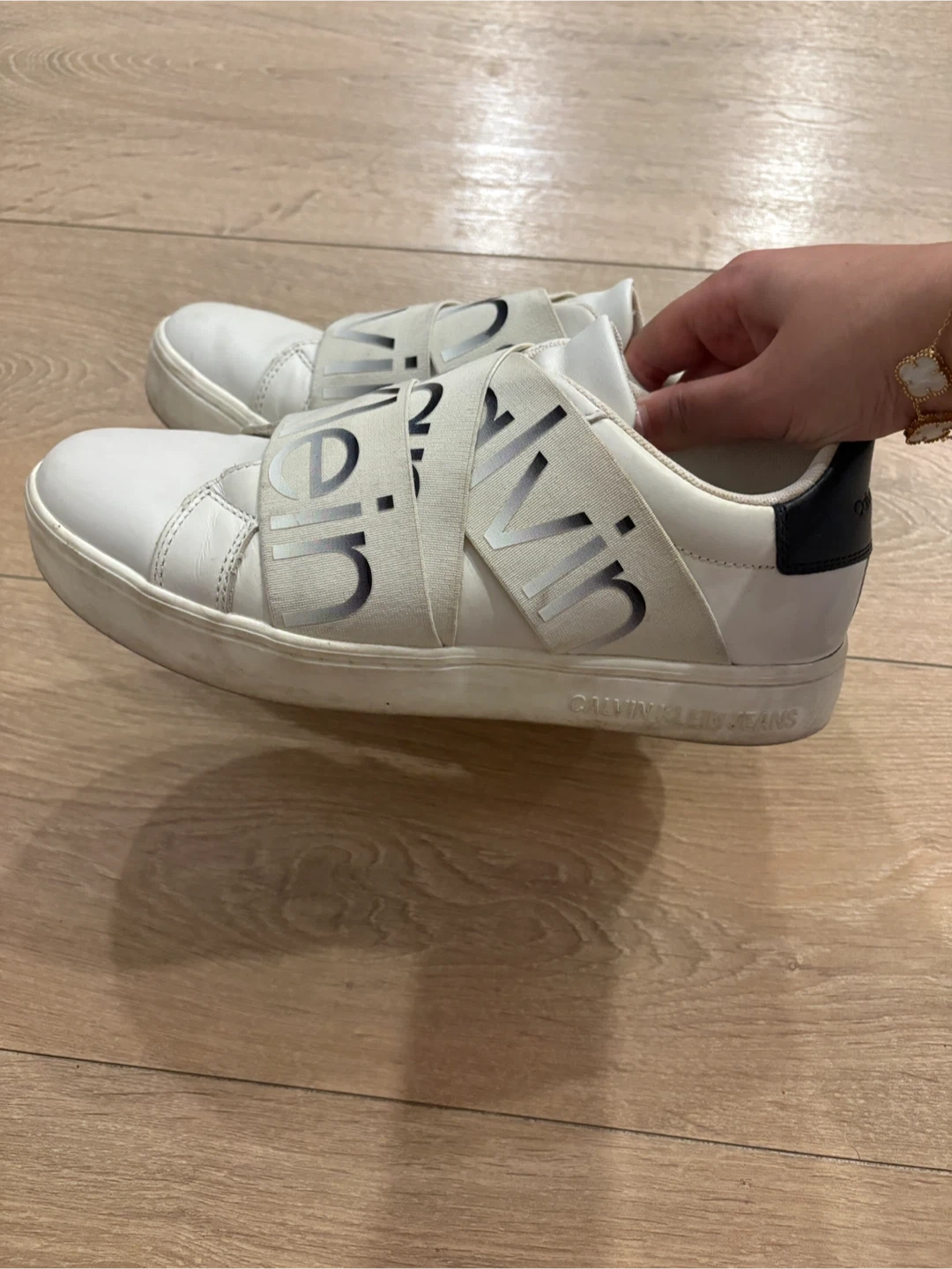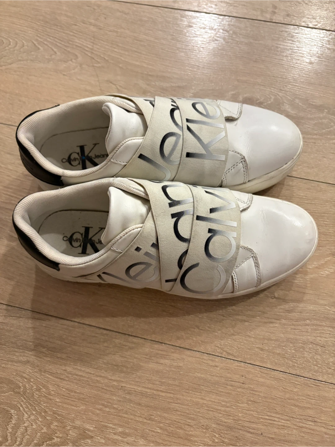 Calvin Klein Jeans slip-on sneakers in white. Features elastic bands with all-over logo print across the vamp. Leather upper with rubber sole.