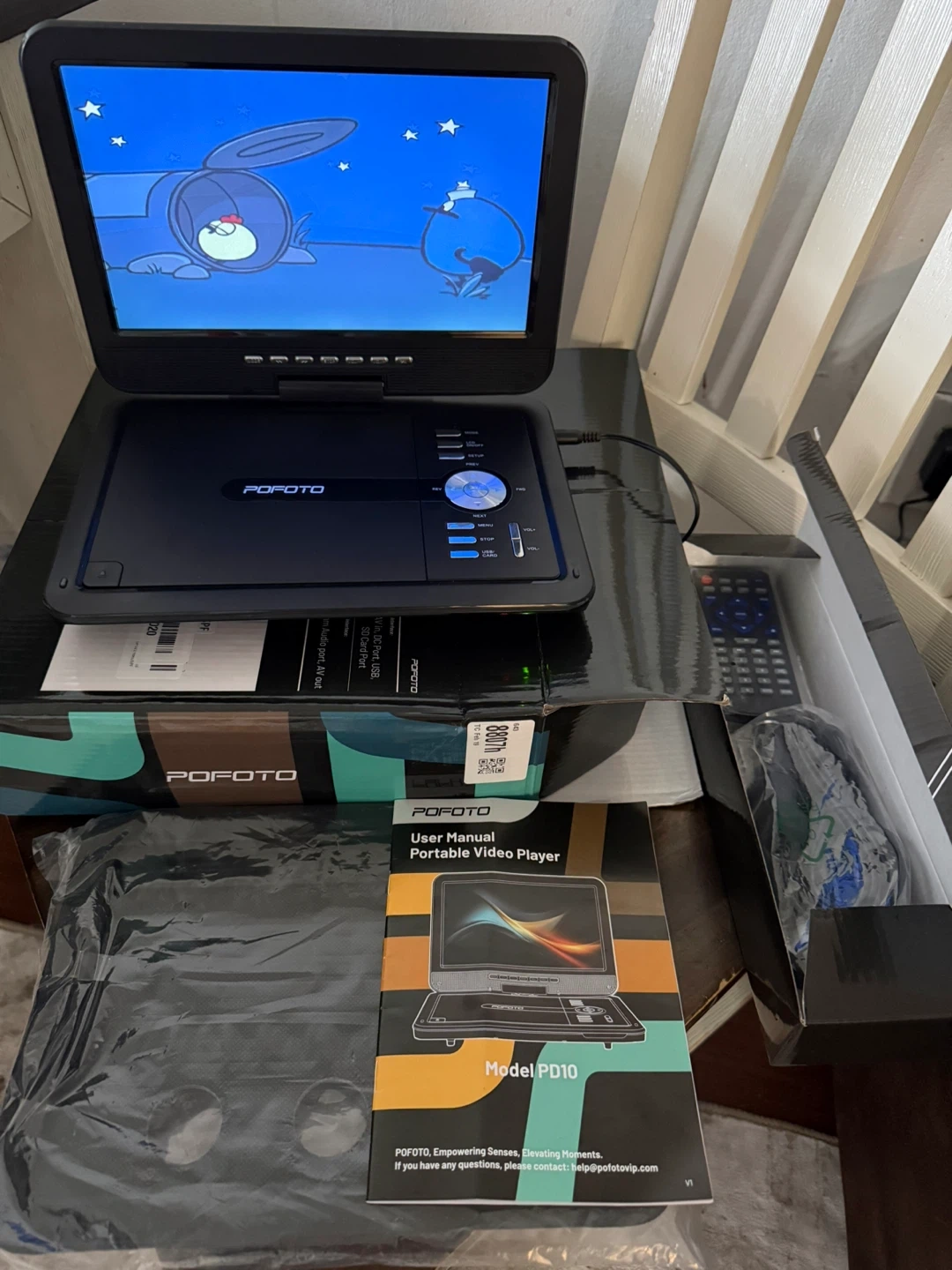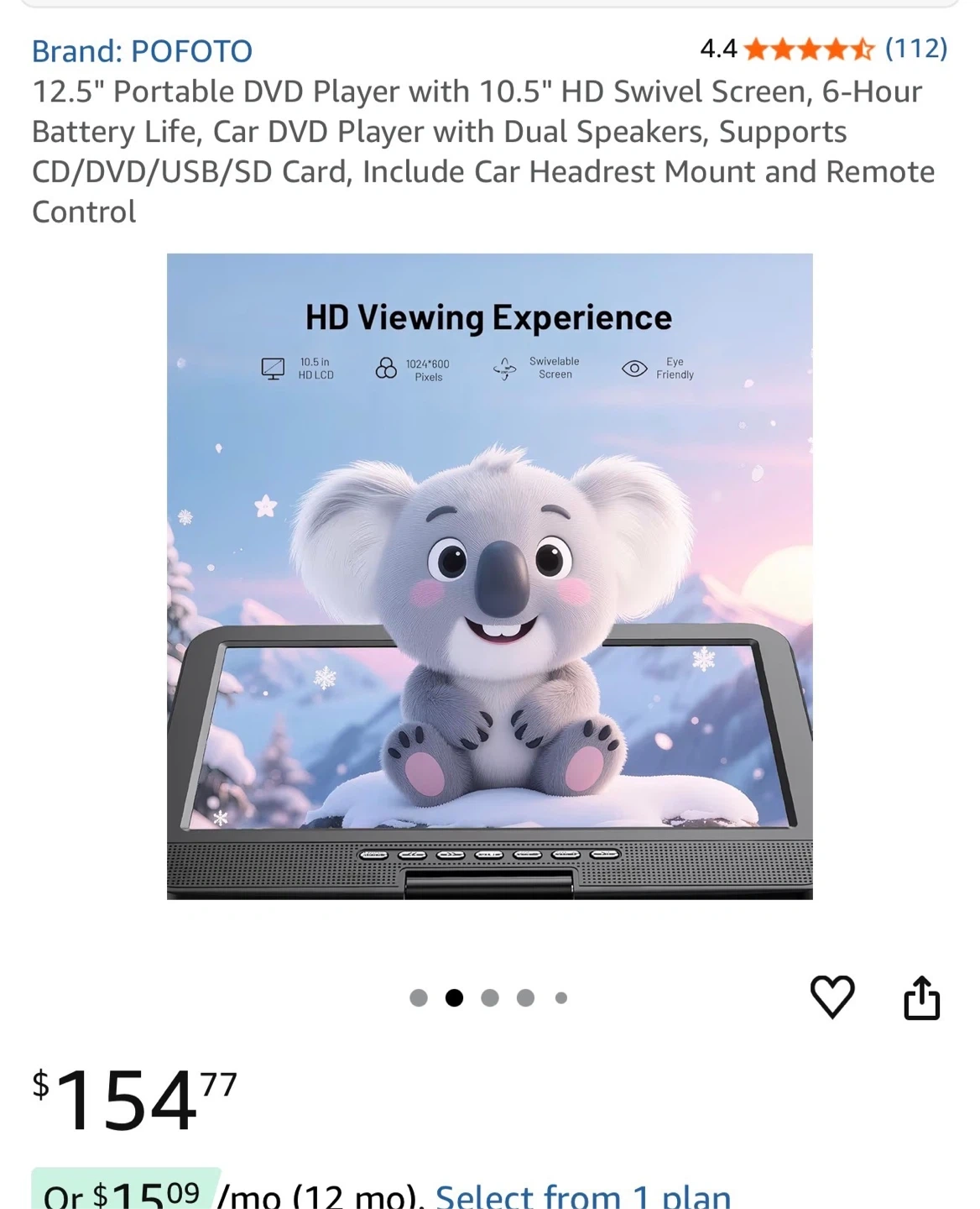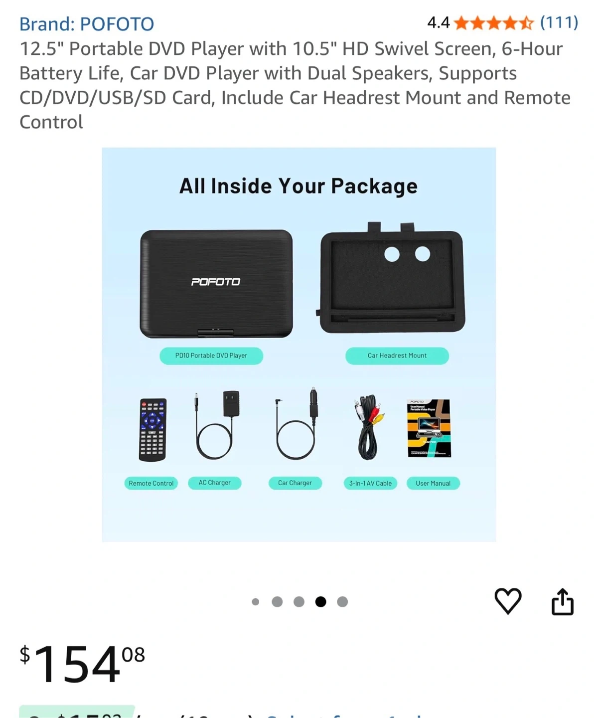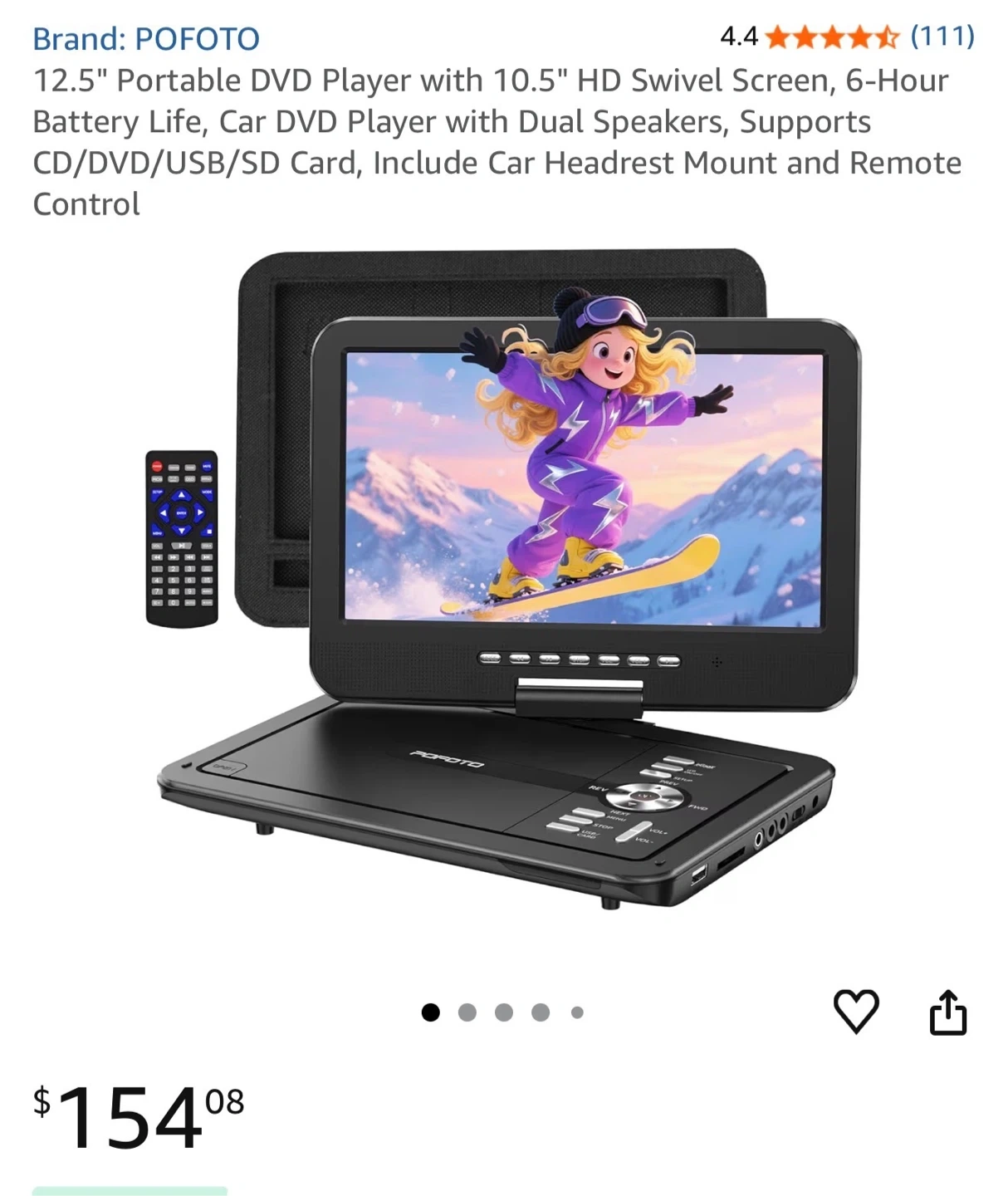 This POFOTO portable DVD player has a 12.5-inch HD swivel screen and a 6-hour battery life. It supports CD/DVD/USB/SD card playback. It includes a car headrest mount and remote control.