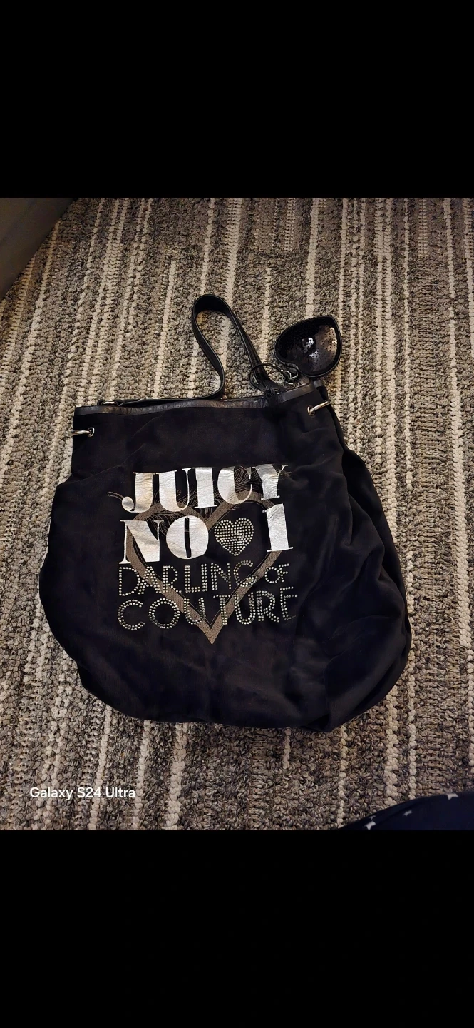Juicy Couture velour hobo bag in black. It's embellished with "Juicy No. 1 Darling of Couture" text and heart design. Features a drawstring closure and dual straps. Brand new but no tags