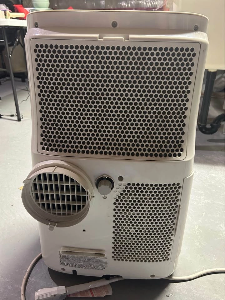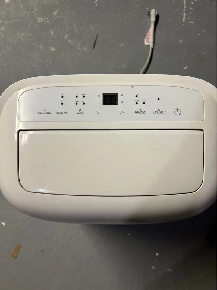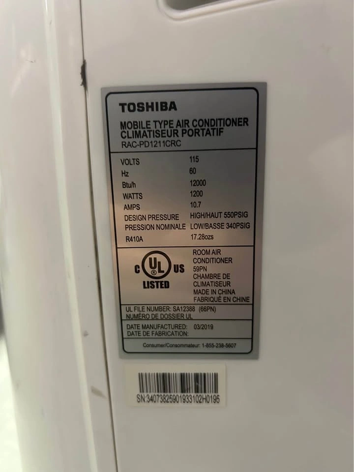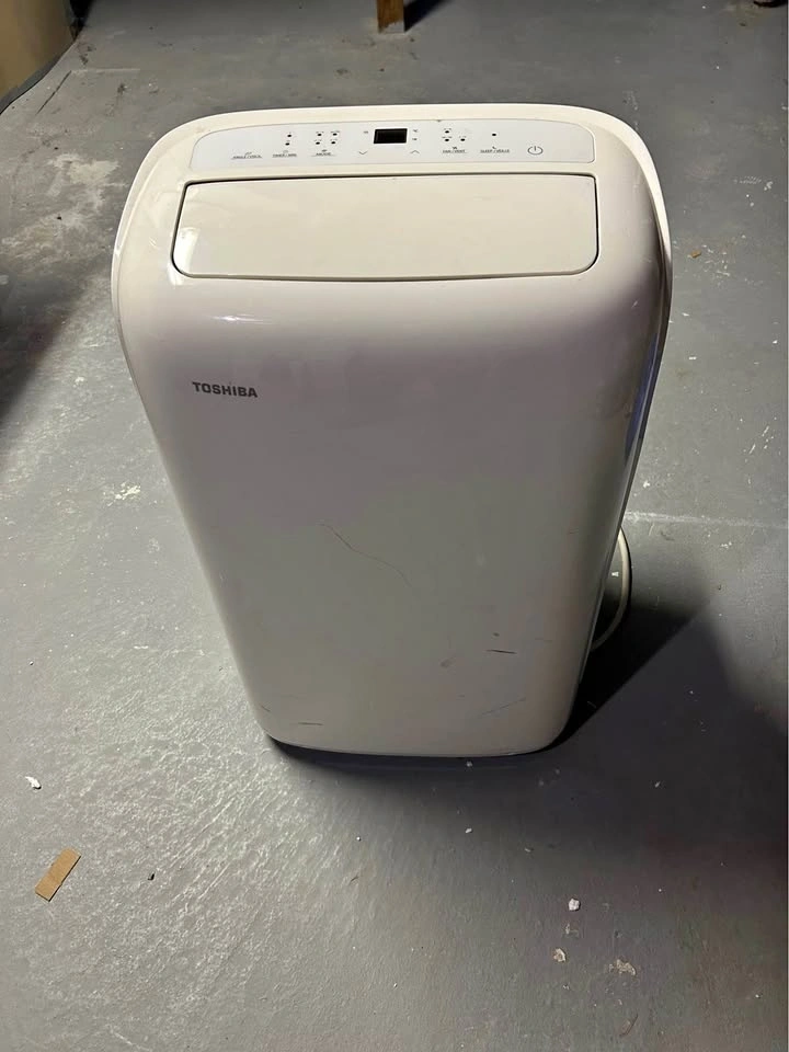 Efficient Toshiba portable air conditioner. This unit is 12000 BTU/h, model RAC-PD1211CRC. Manufactured March 2019. Has some scratches on the body. Comes with exhaust hose.