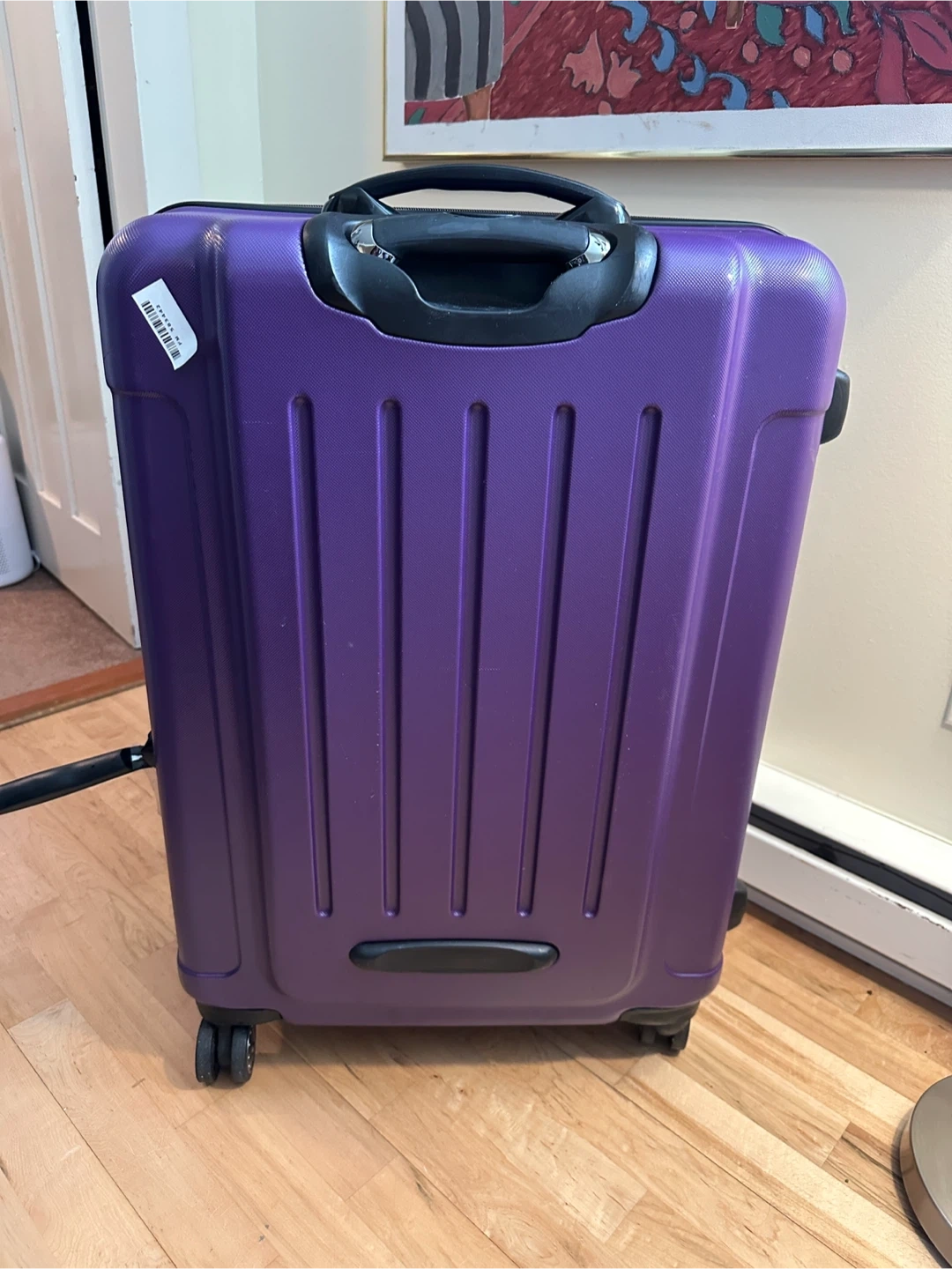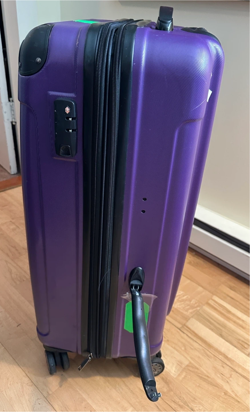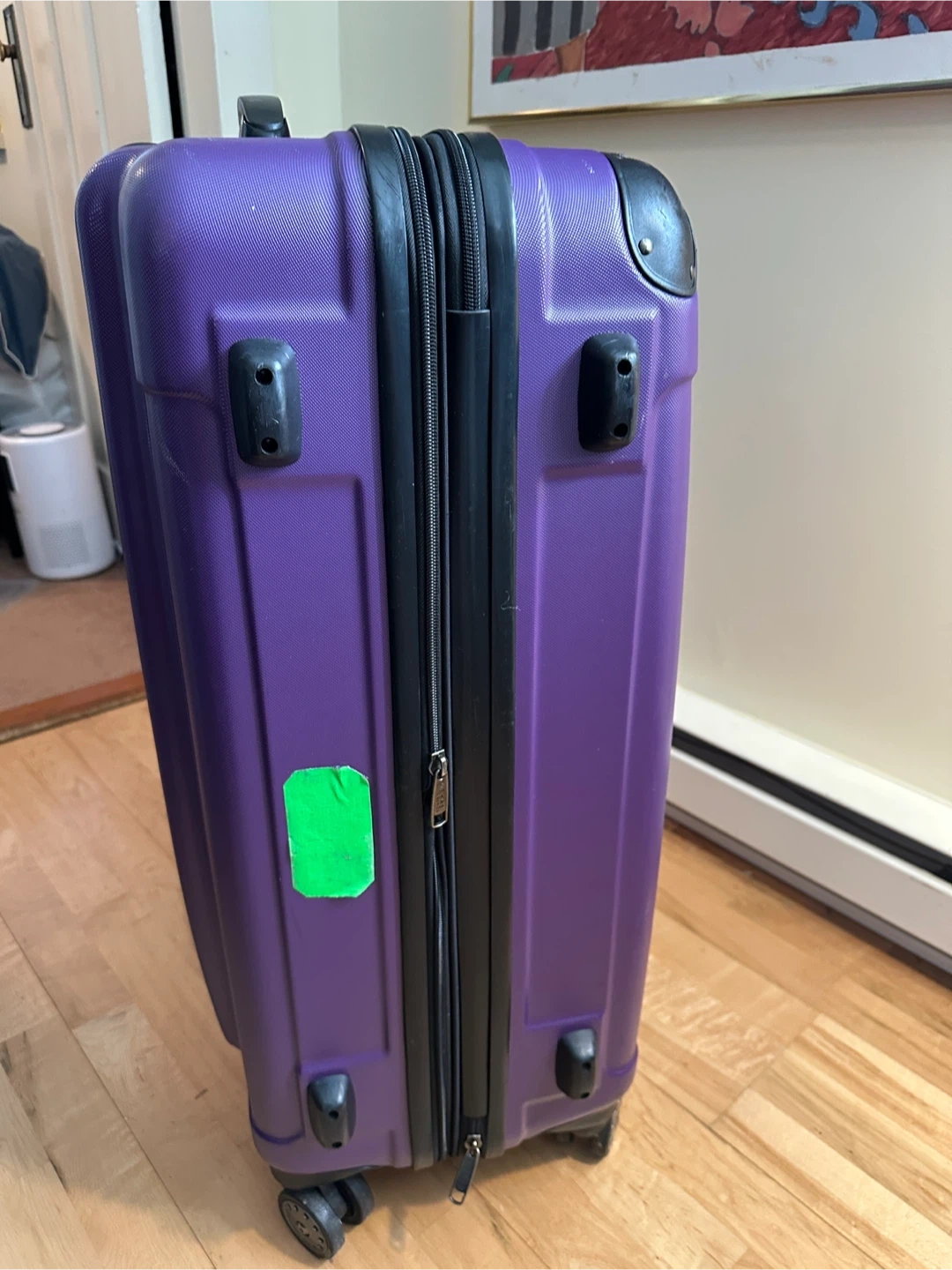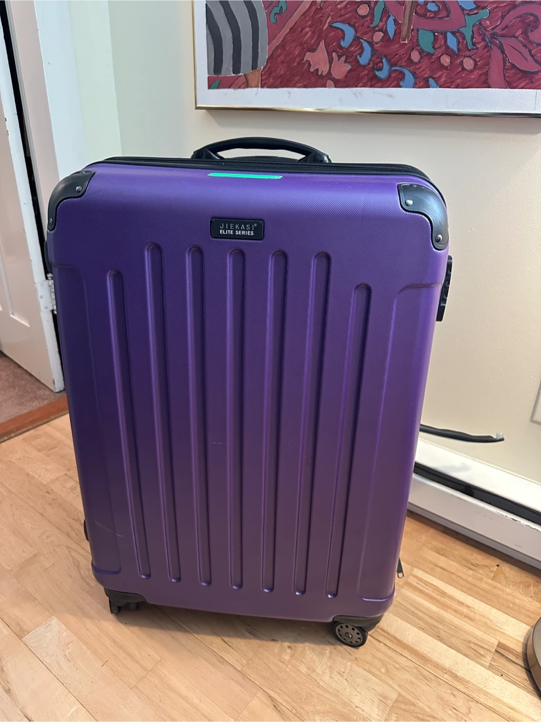 This Jiekasi Elite Series luggage is a vibrant purple colour. It has a hard shell with no cracks. The wheels spin smoothly 360 degrees. Interior organizational pockets. Larger size than standard luggage. Expandable zippers, zippers work great.
