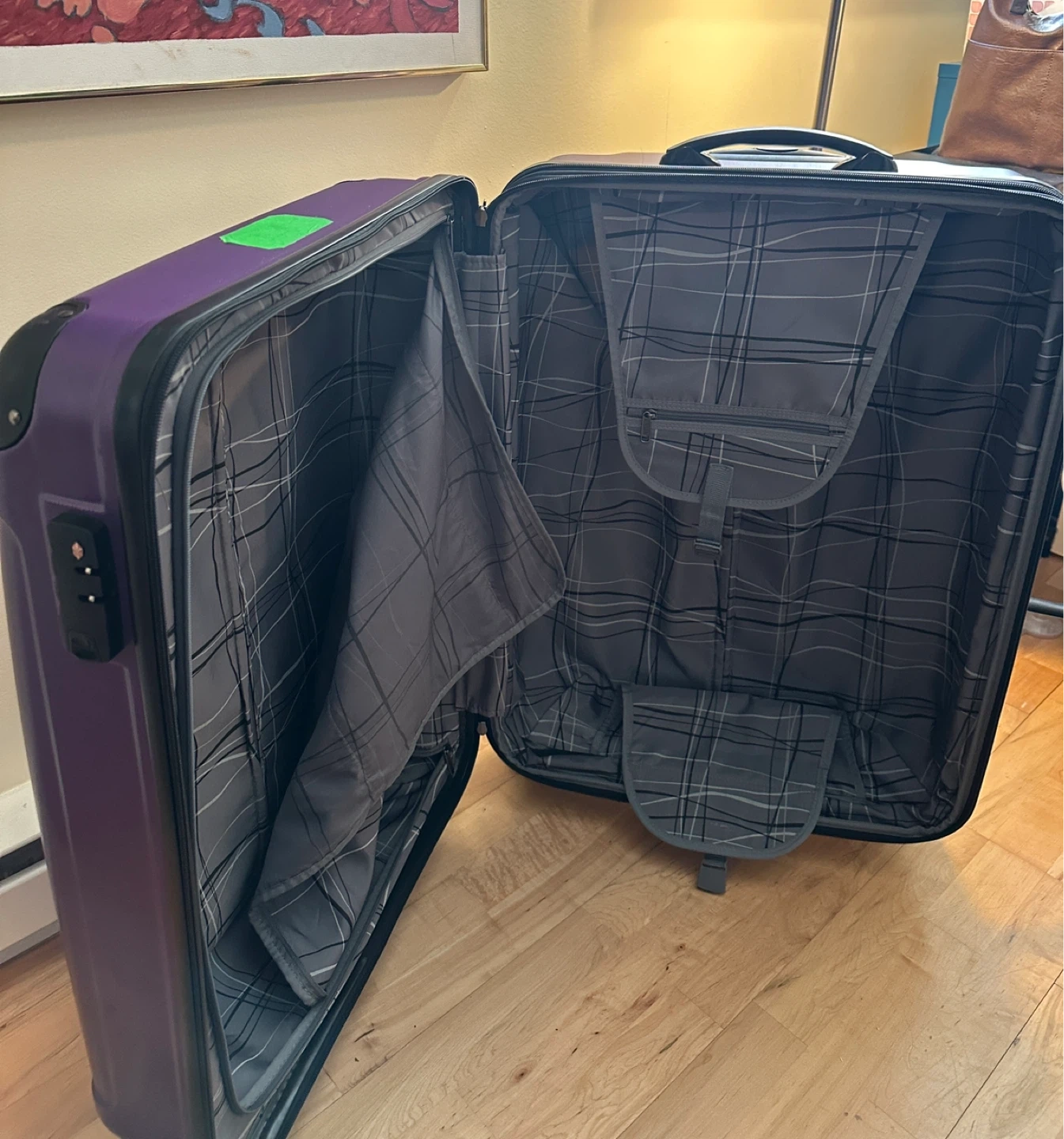 This Jiekasi Elite Series luggage is a vibrant purple colour. It has a hard shell with no cracks. The wheels spin smoothly 360 degrees. Interior organizational pockets. Larger size than standard luggage. Expandable zippers, zippers work great.