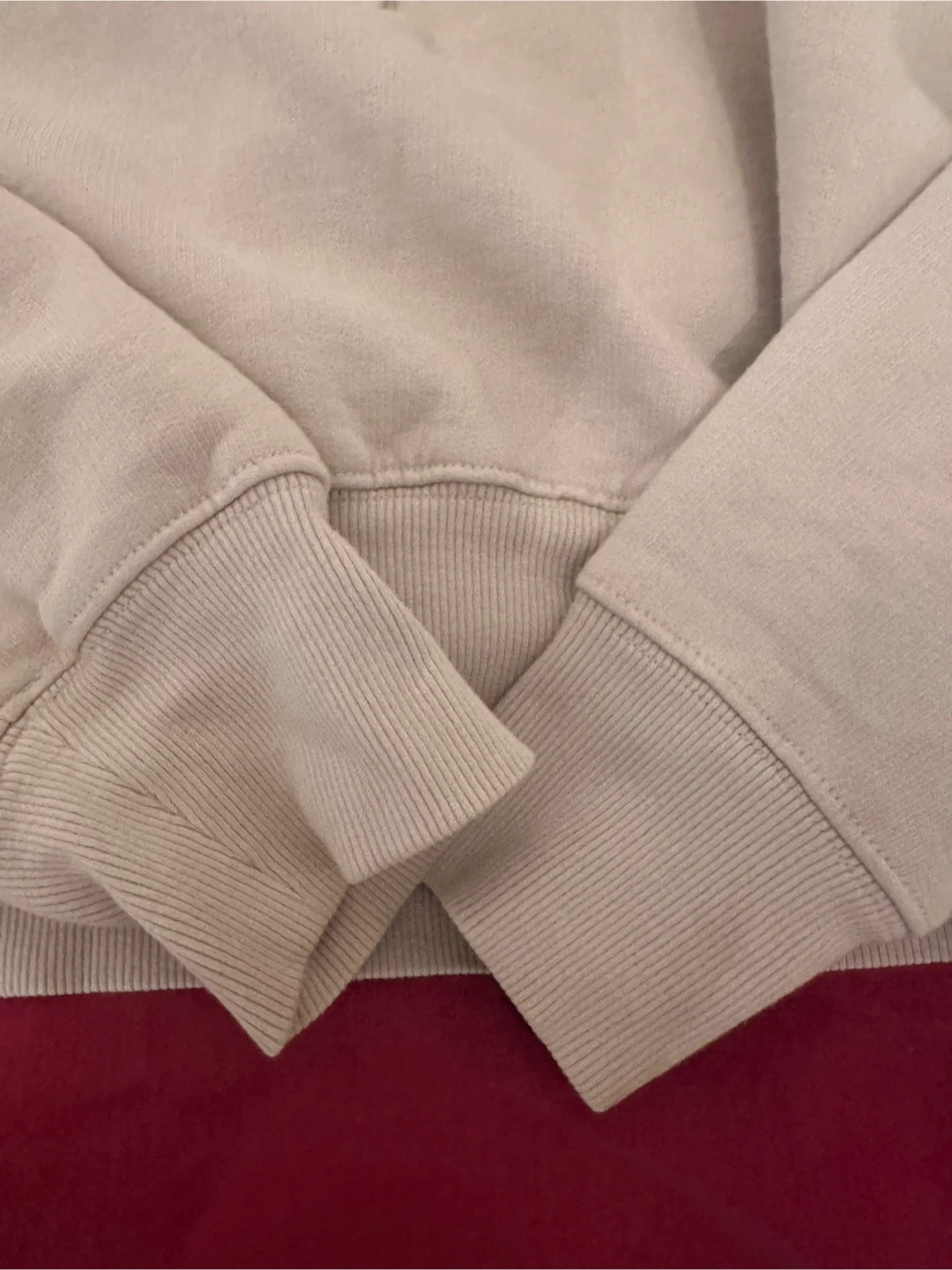 This Wilfred Free quarter zip sweatshirt is a lovely cream colour. It's made from a soft, fleecy material. It has a zippered neckline for easy wear.