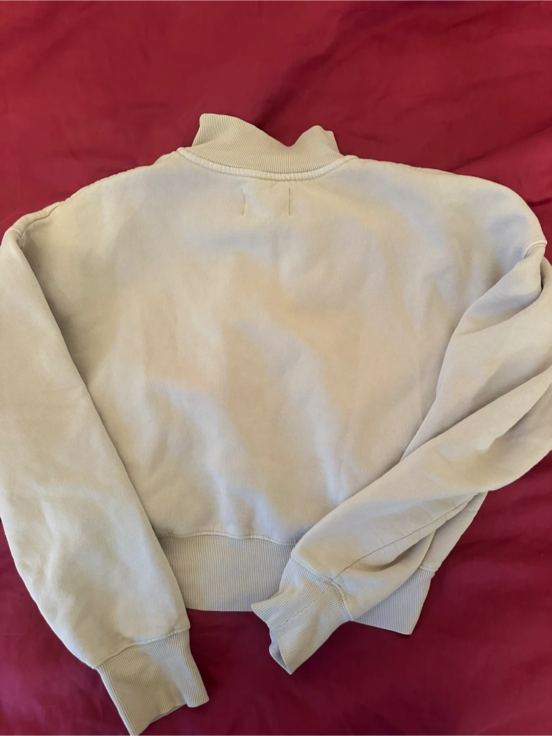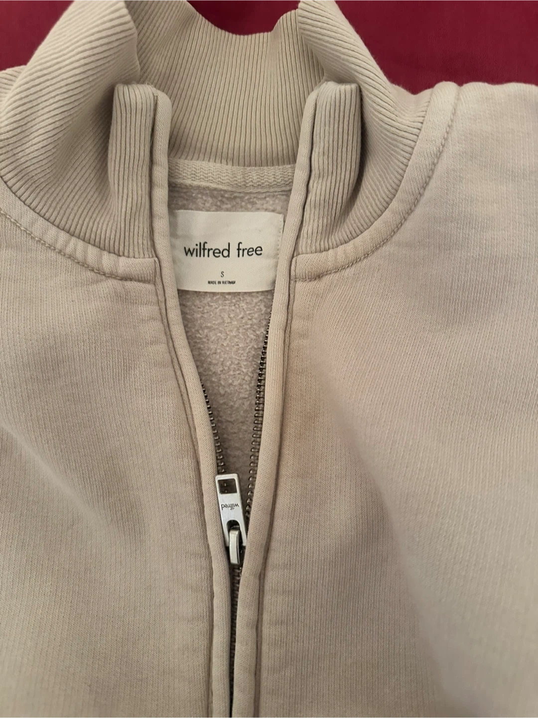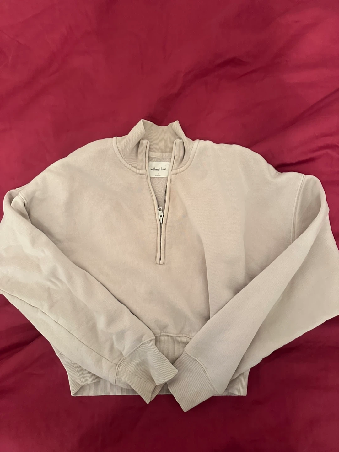 This Wilfred Free quarter zip sweatshirt is a lovely cream colour. It's made from a soft, fleecy material. It has a zippered neckline for easy wear.