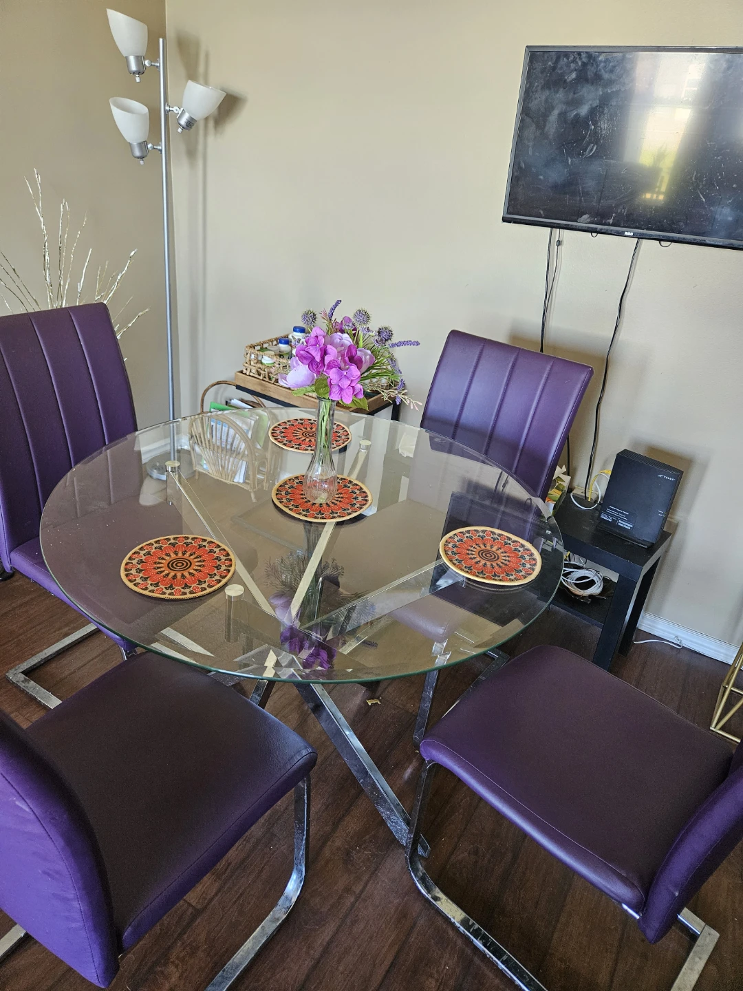 Selling a glass top dining table with four purple chairs. It's a stylish set that would look great in any dining room or kitchen. The chairs have a unique chrome base and a comfortable padded seat. The table is in good condition and ready to be used for many meals to come