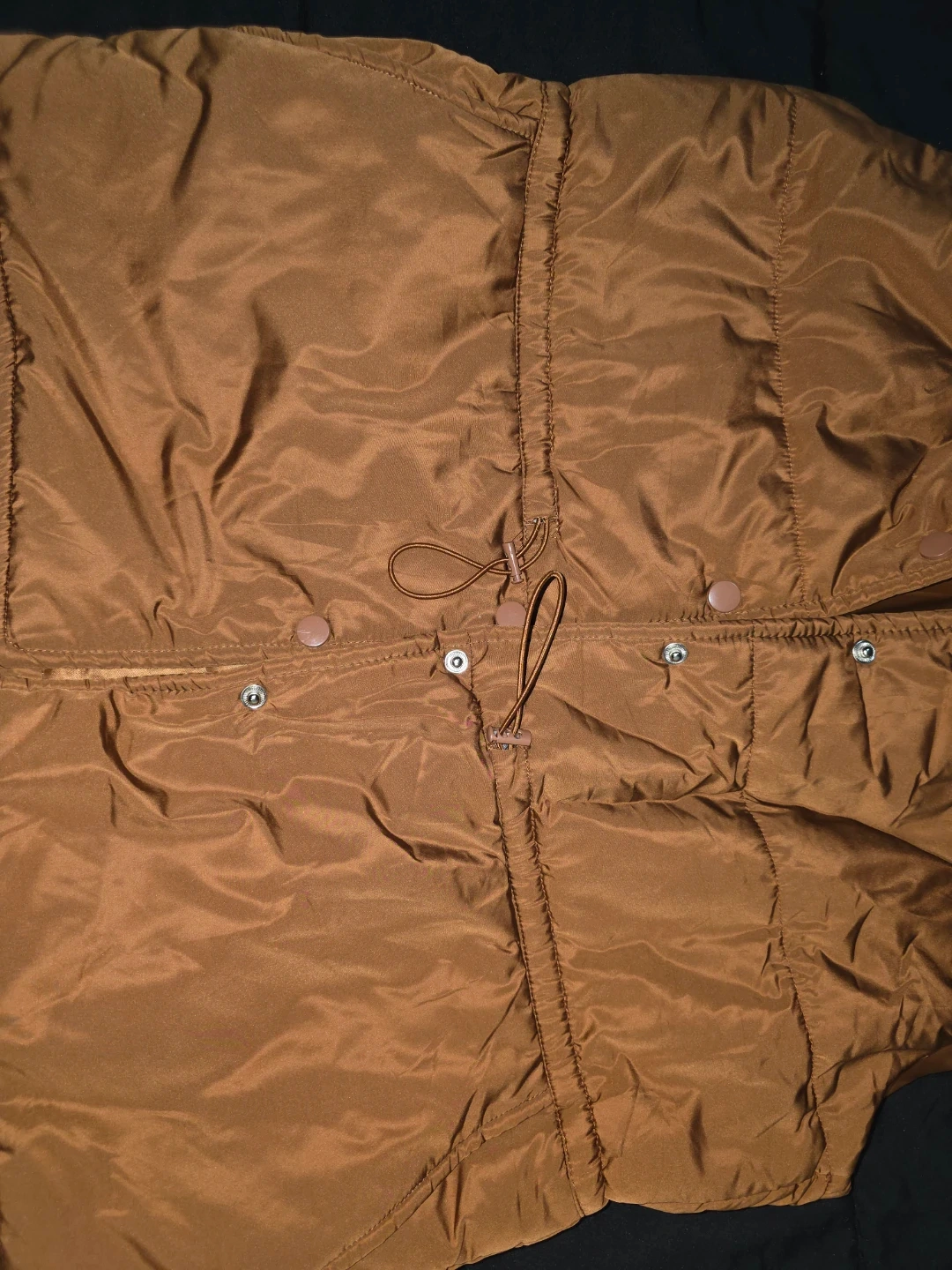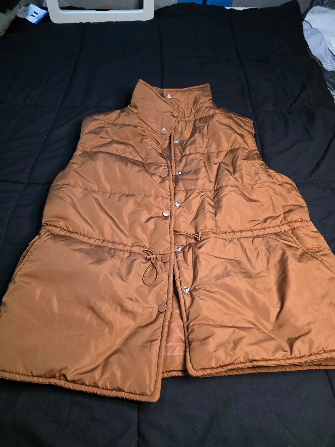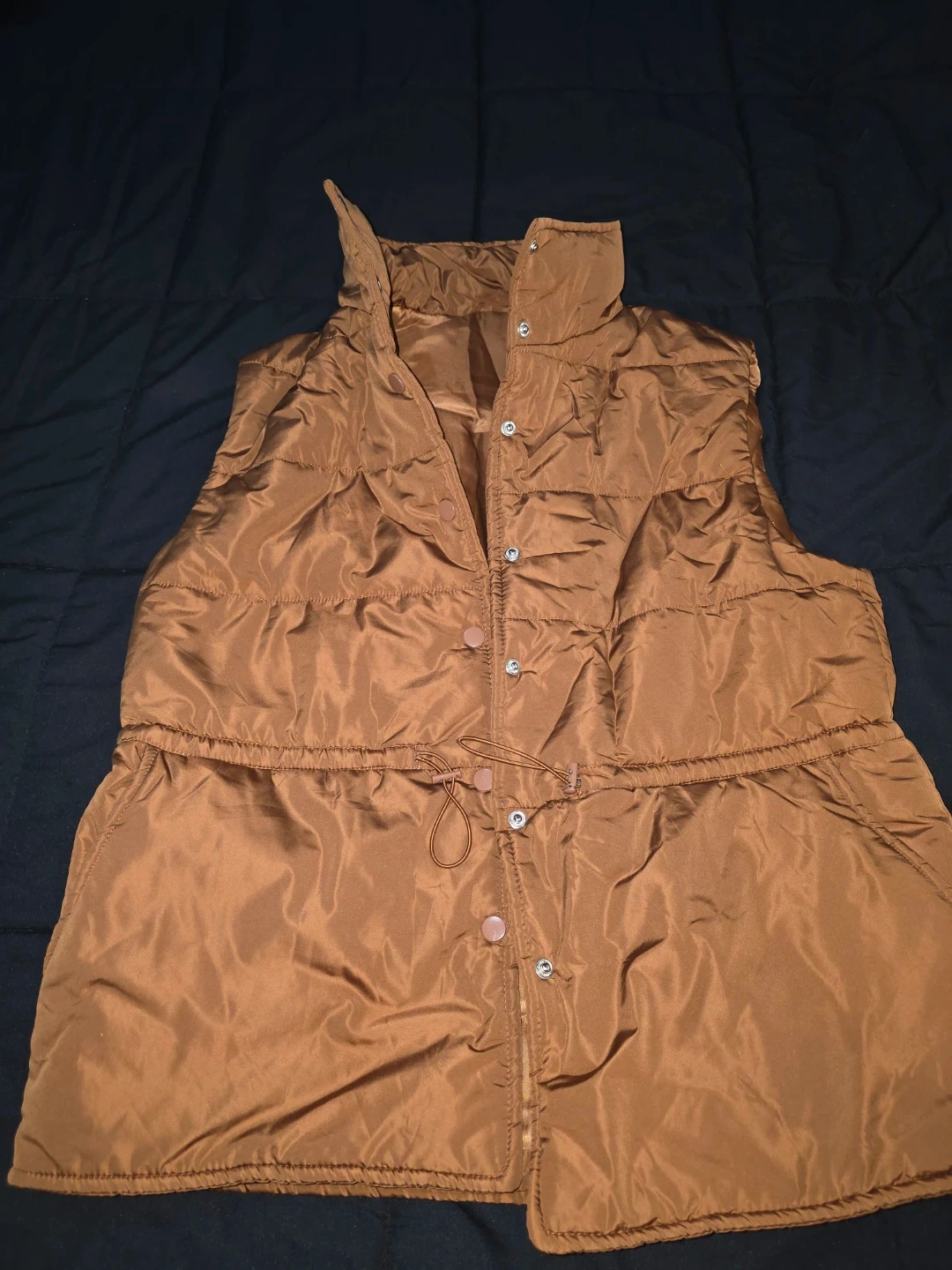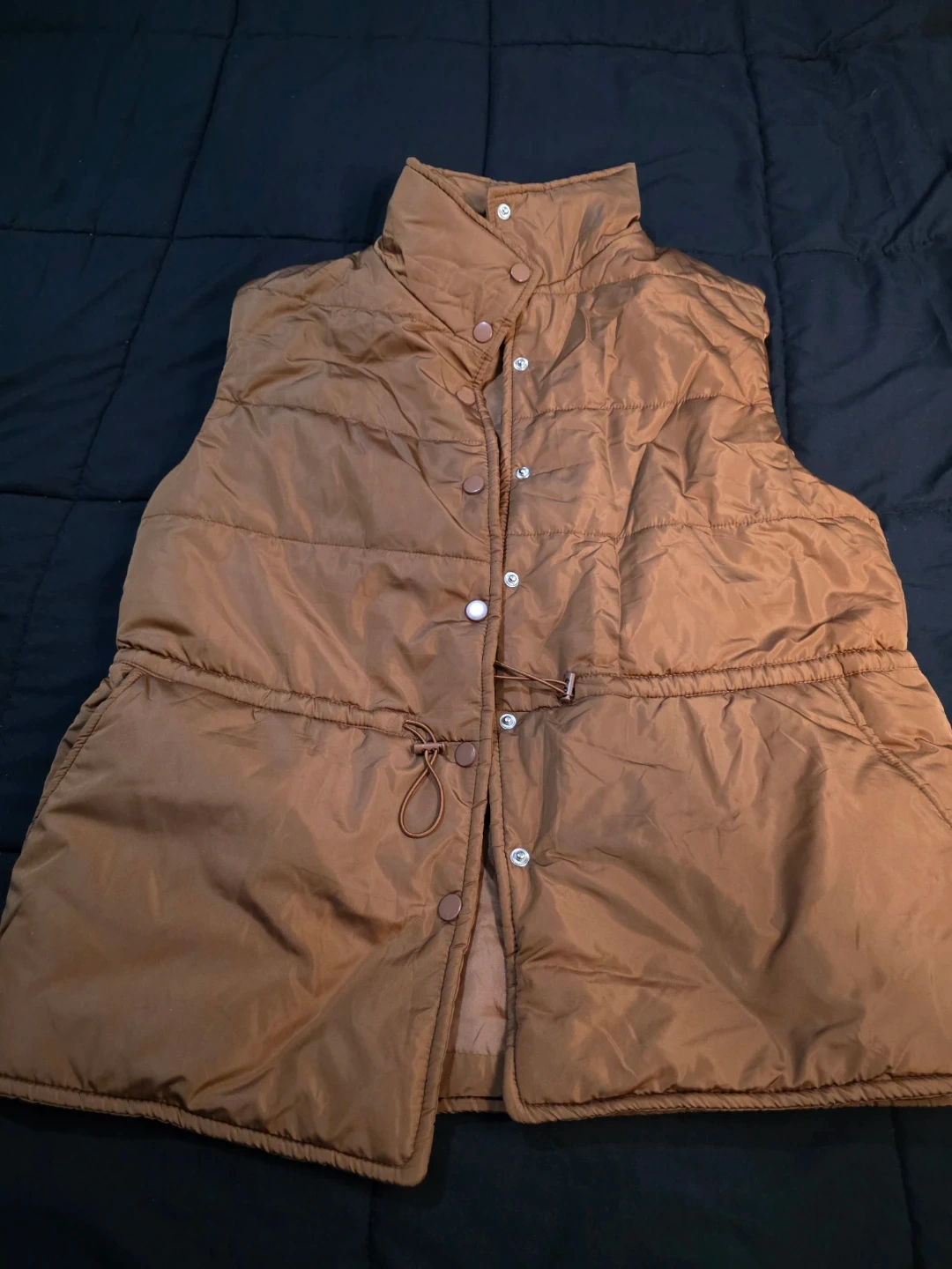 Here's a stylish brown puffer vest! It features a button-up front and a drawstring waist for a customizable fit. Perfect for layering during those transitional weather days