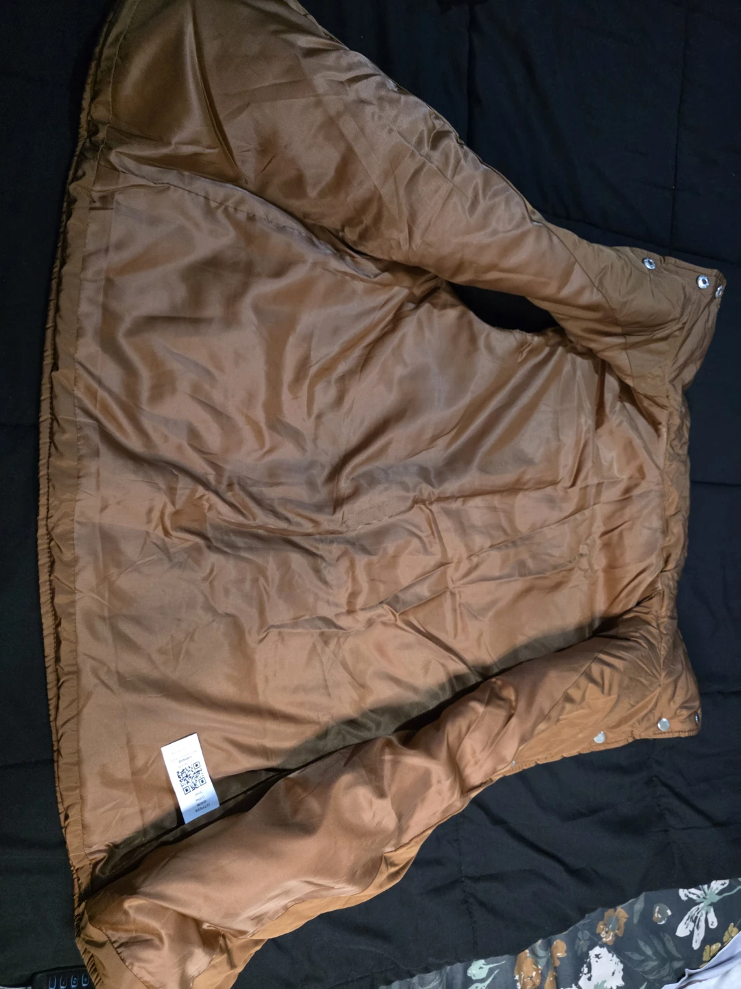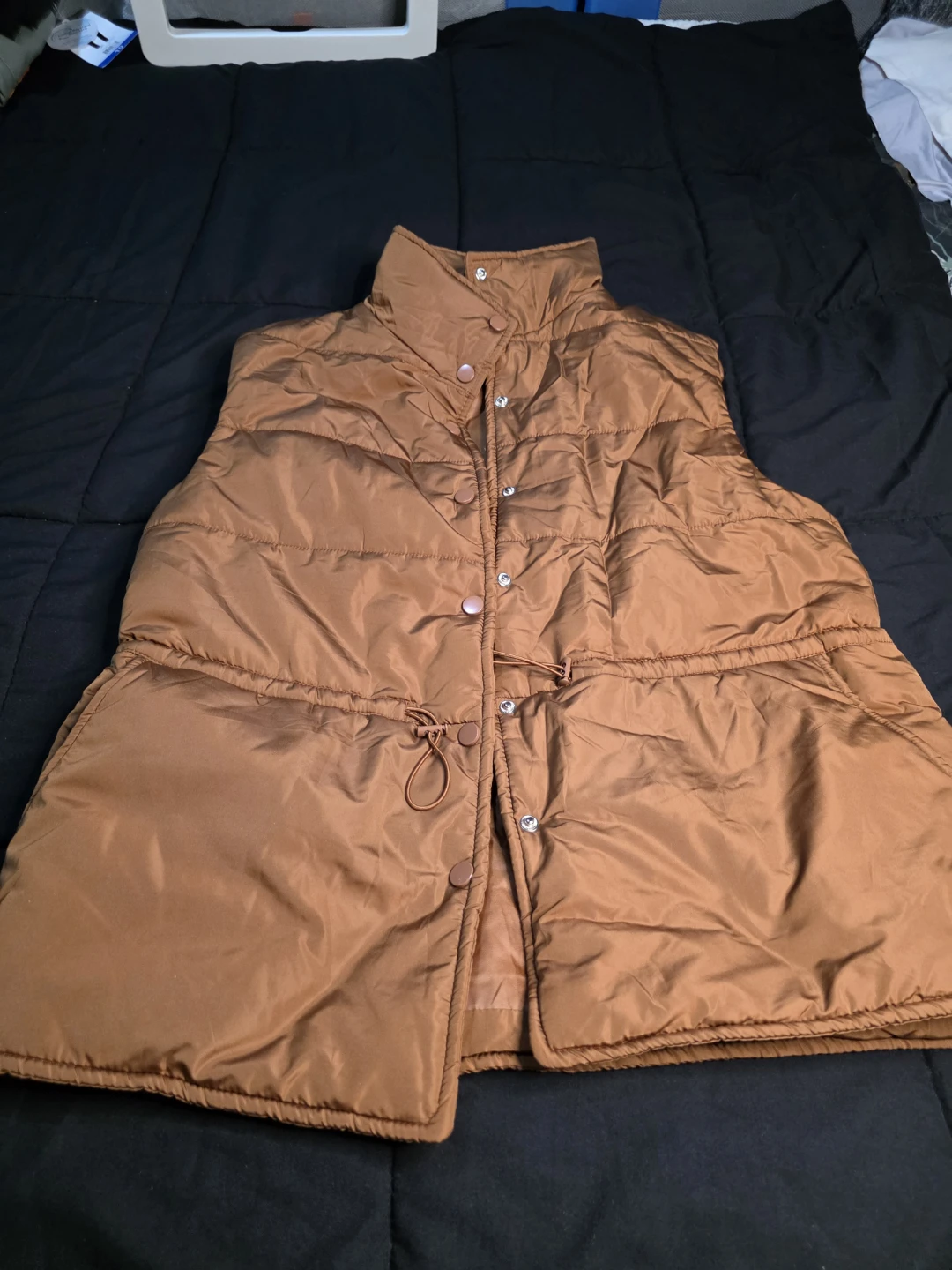 Here's a stylish brown puffer vest! It features a button-up front and a drawstring waist for a customizable fit. Perfect for layering during those transitional weather days