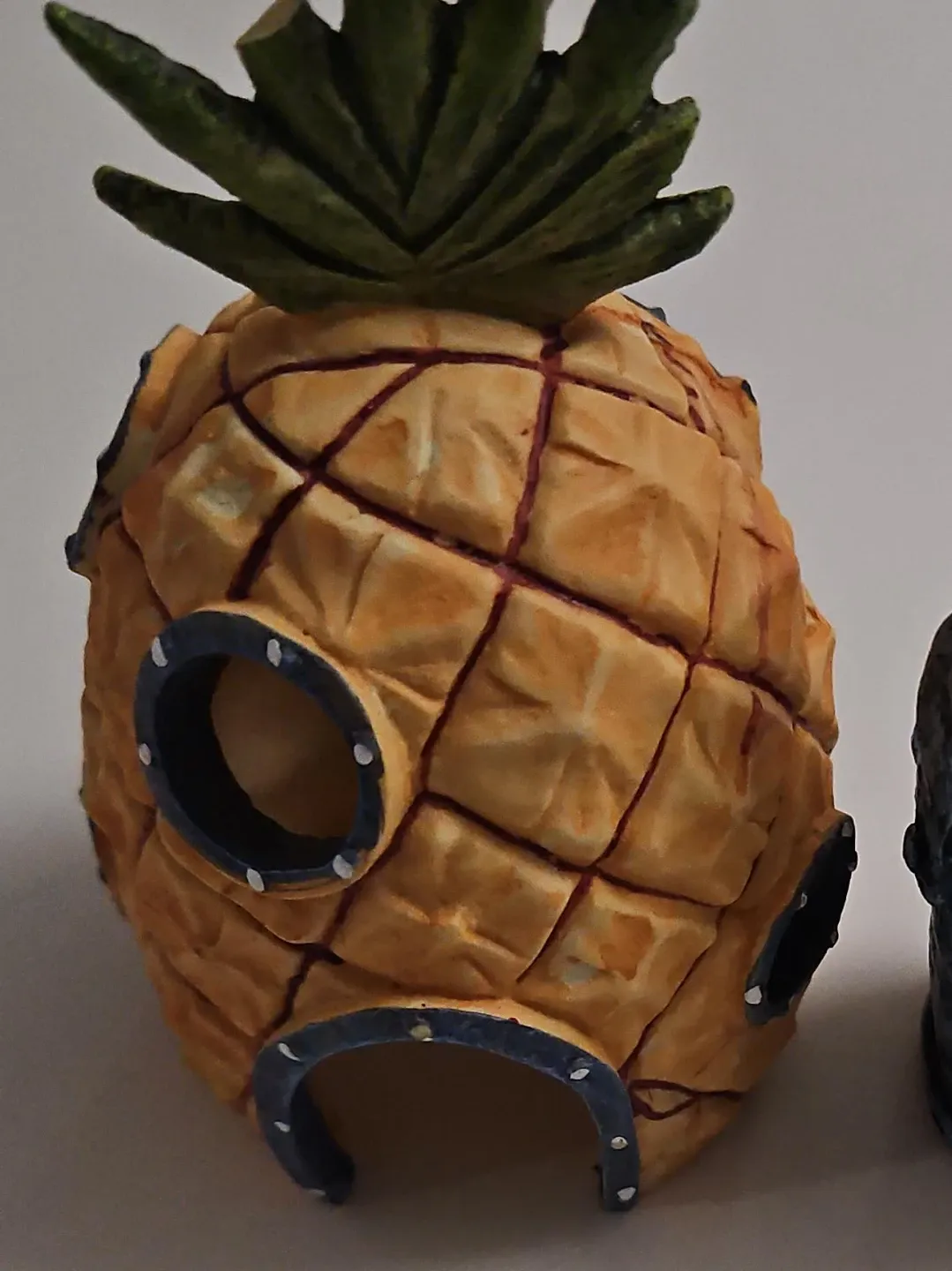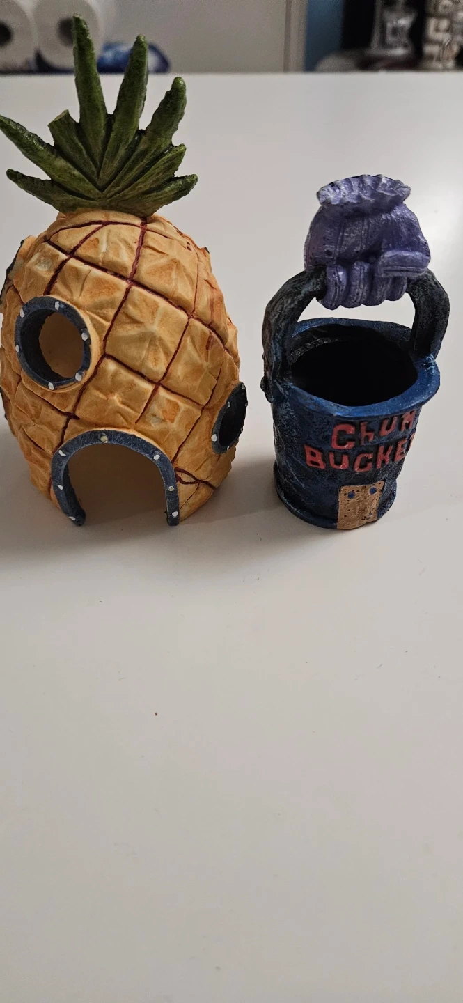 This set features a pineapple house, similar to SpongeBob's home, and a miniature Chum Bucket. Both pieces are designed for decorative display or play. They're made from a durable resin material.