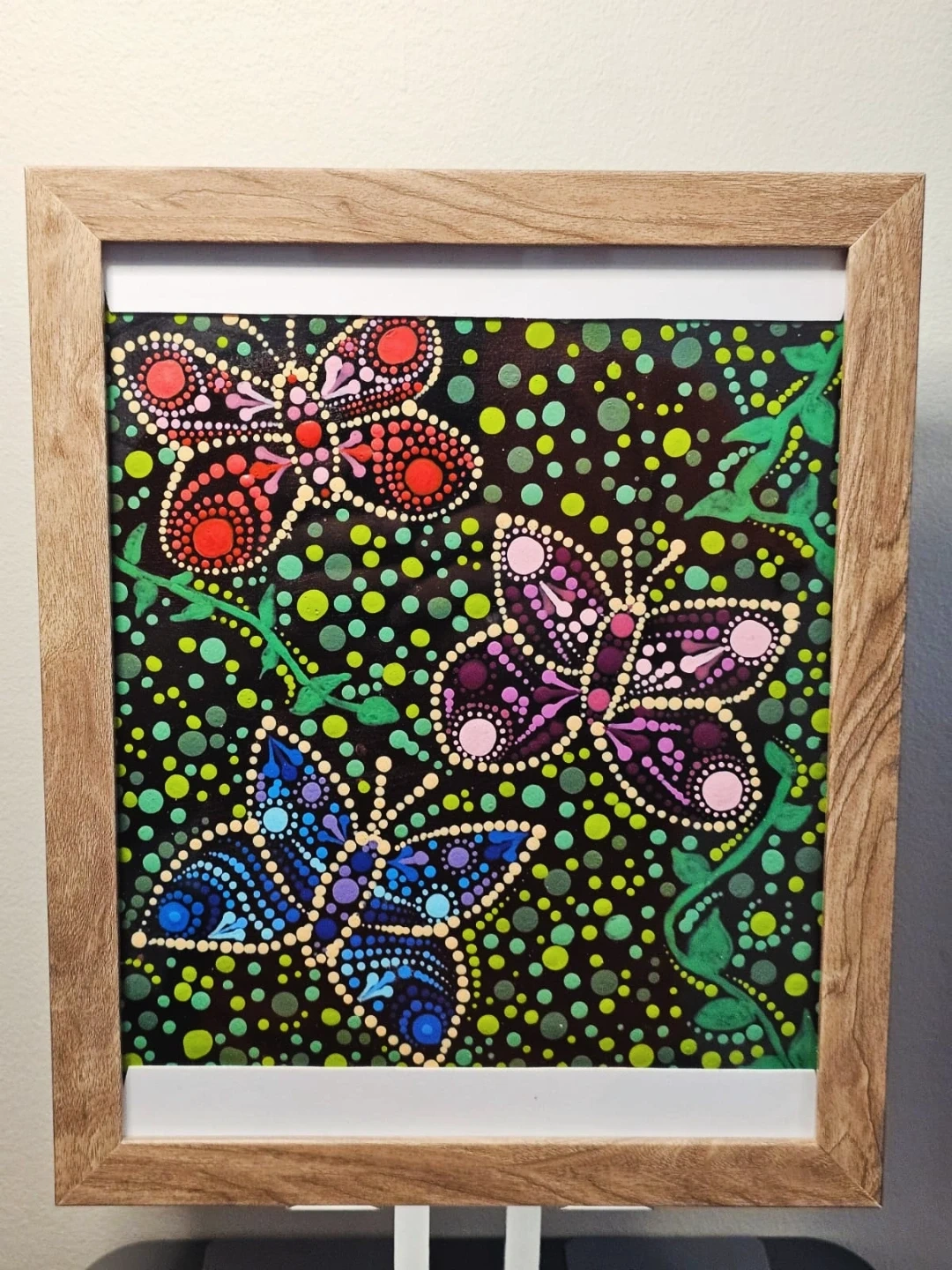 Framed dot art painting featuring three colourful butterflies. Black background with vibrant green and blue dots. Wood-effect frame included. It's a lovely piece for home decor!