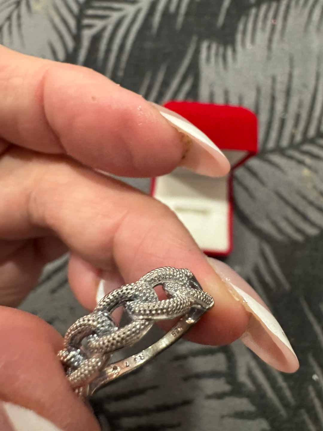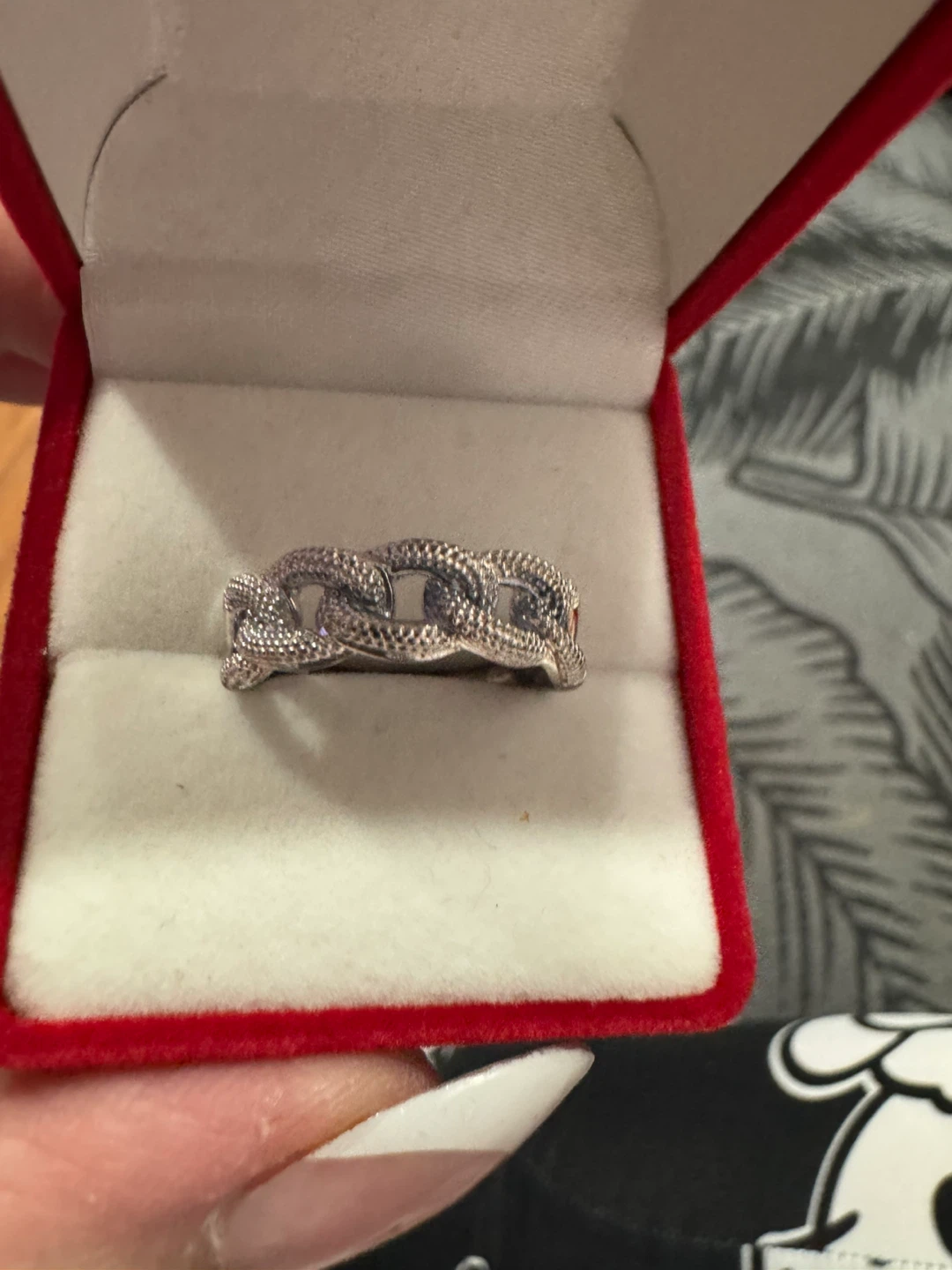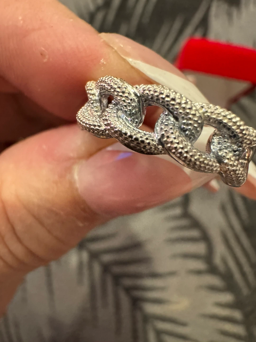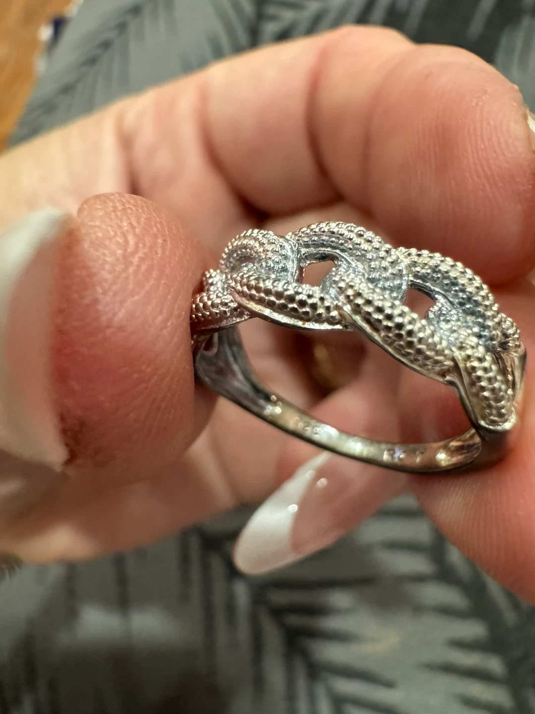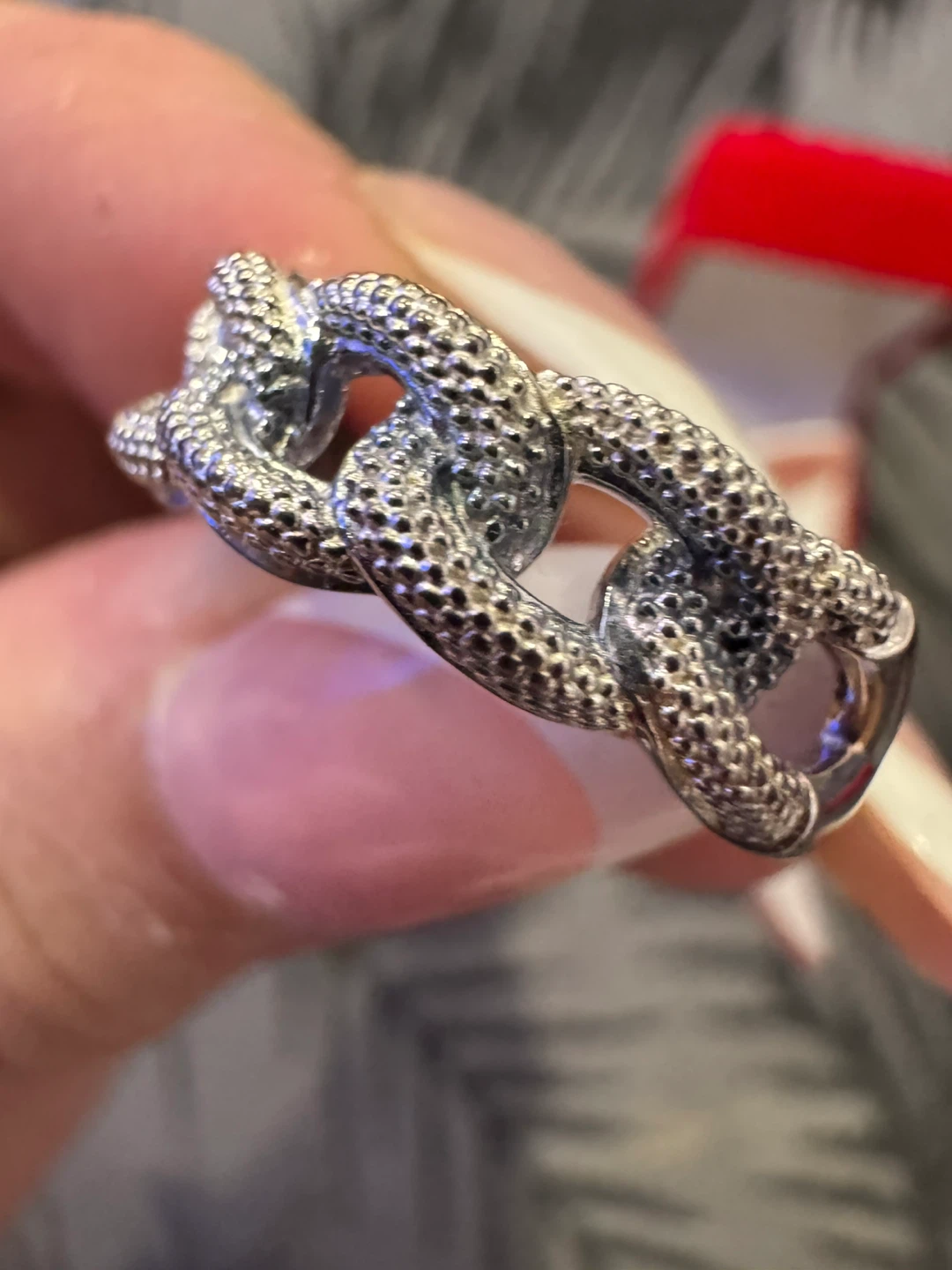 1 / 71 / 7Buy & SellSterling Silver Chain Link RingSterling Silver Chain Link Ring$40It's a sterling silver ring with a textured chain link design. Stamped with "925". Comes with a red ring box.ConditionNewSize7.5WHERE TO MEETCheck LocationView MapSELLERverifiedMaryAurora Centre N782 reviews0 chats·2 favorites·36 viewsSEND CHAT TO SELLERHi Mary! I’m interested in your listing.Hi Mary! I’m interested in your listing.Get the Karrot app to chatSign In to chat