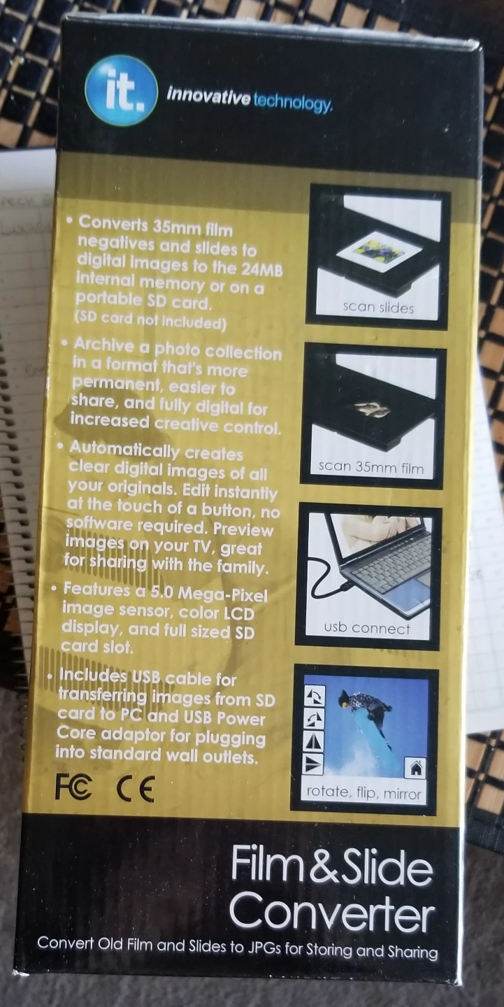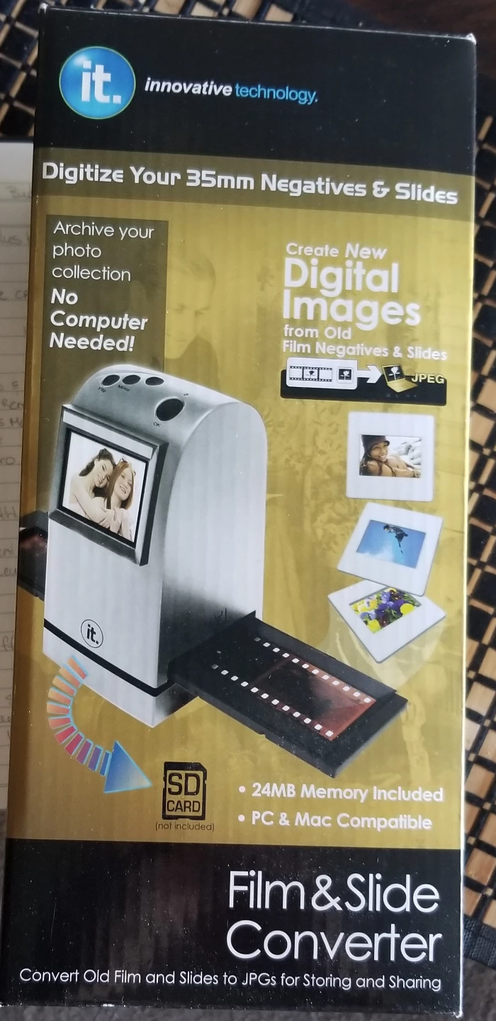 Digitize your 35mm negatives and slides into digital images. It has a 5.0 Mega-Pixel image sensor and a full-sized SD card slot. Includes USB cable for transferring images. Item could be considered new in box as has never used