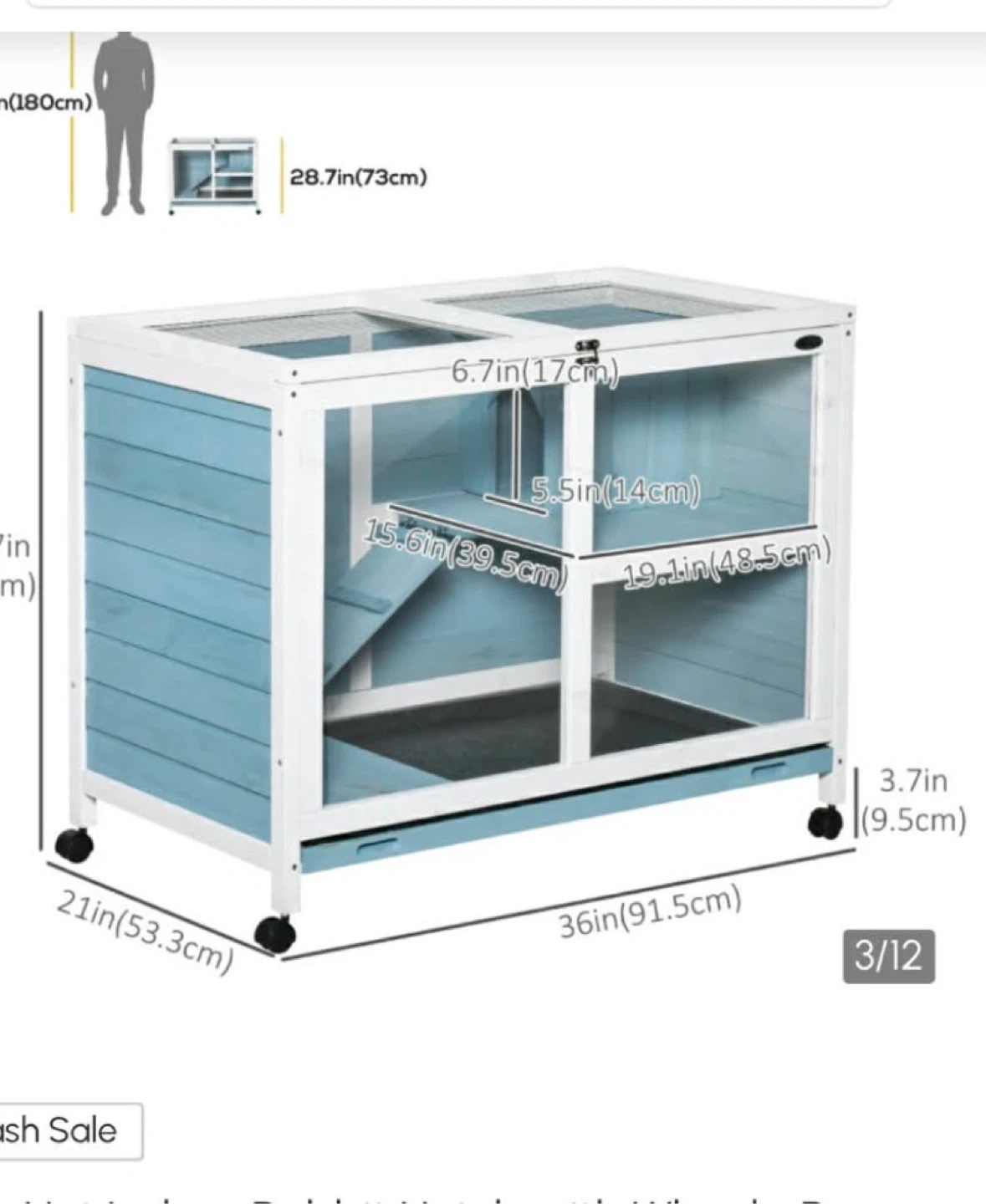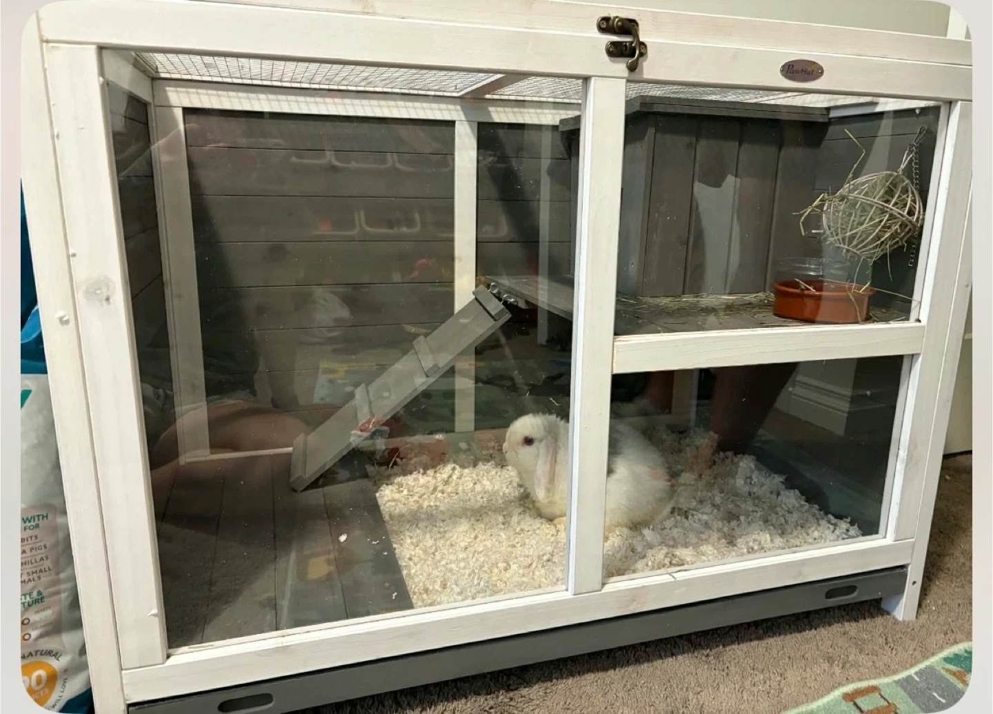 Rabbit Hutch comes with big bag of Timothy Hay, shavings/bedding and a ball for the hay Two-tiered wooden hutch for small pets. Features glass panels, a ramp, and wheels for easy movement. 36" long, 21" high, and 28.7" deep.