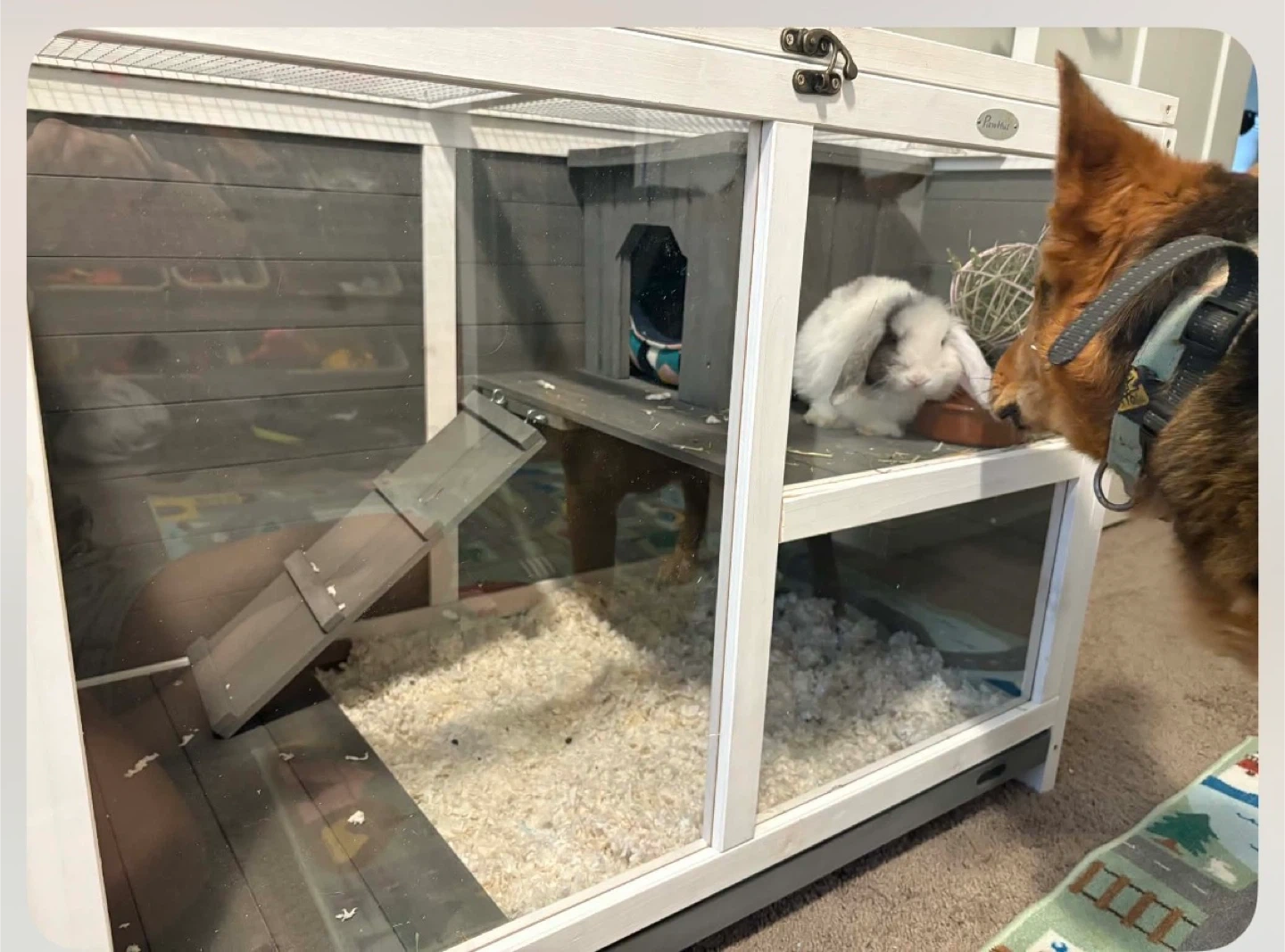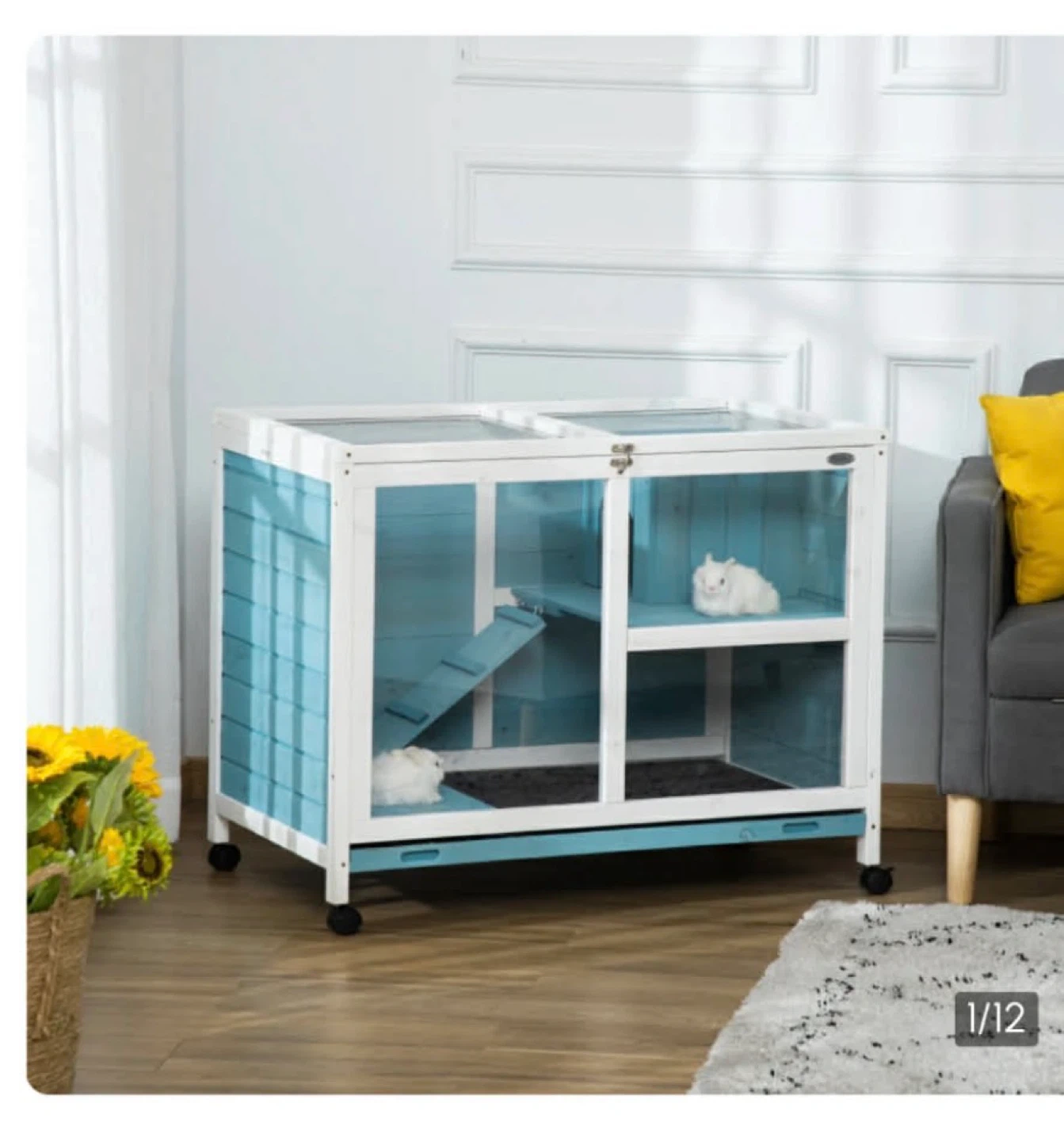Rabbit Hutch comes with big bag of Timothy Hay, shavings/bedding and a ball for the hay Two-tiered wooden hutch for small pets. Features glass panels, a ramp, and wheels for easy movement. 36" long, 21" high, and 28.7" deep.