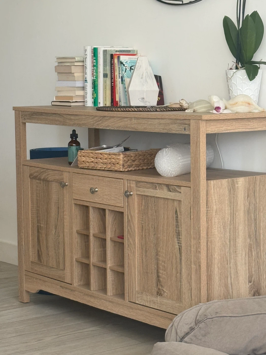 Light oak finish console table with two doors, a drawer, and a built-in wine rack. It has open shelving on top and inside the cabinets. Perfect for a dining room or entryway!