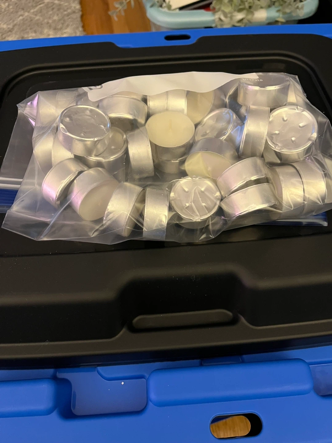 A bag full of tealight candles, approximately 38 in total. These are standard size tealights in metal cups. They're great for creating ambiance or for use in wax warmers.