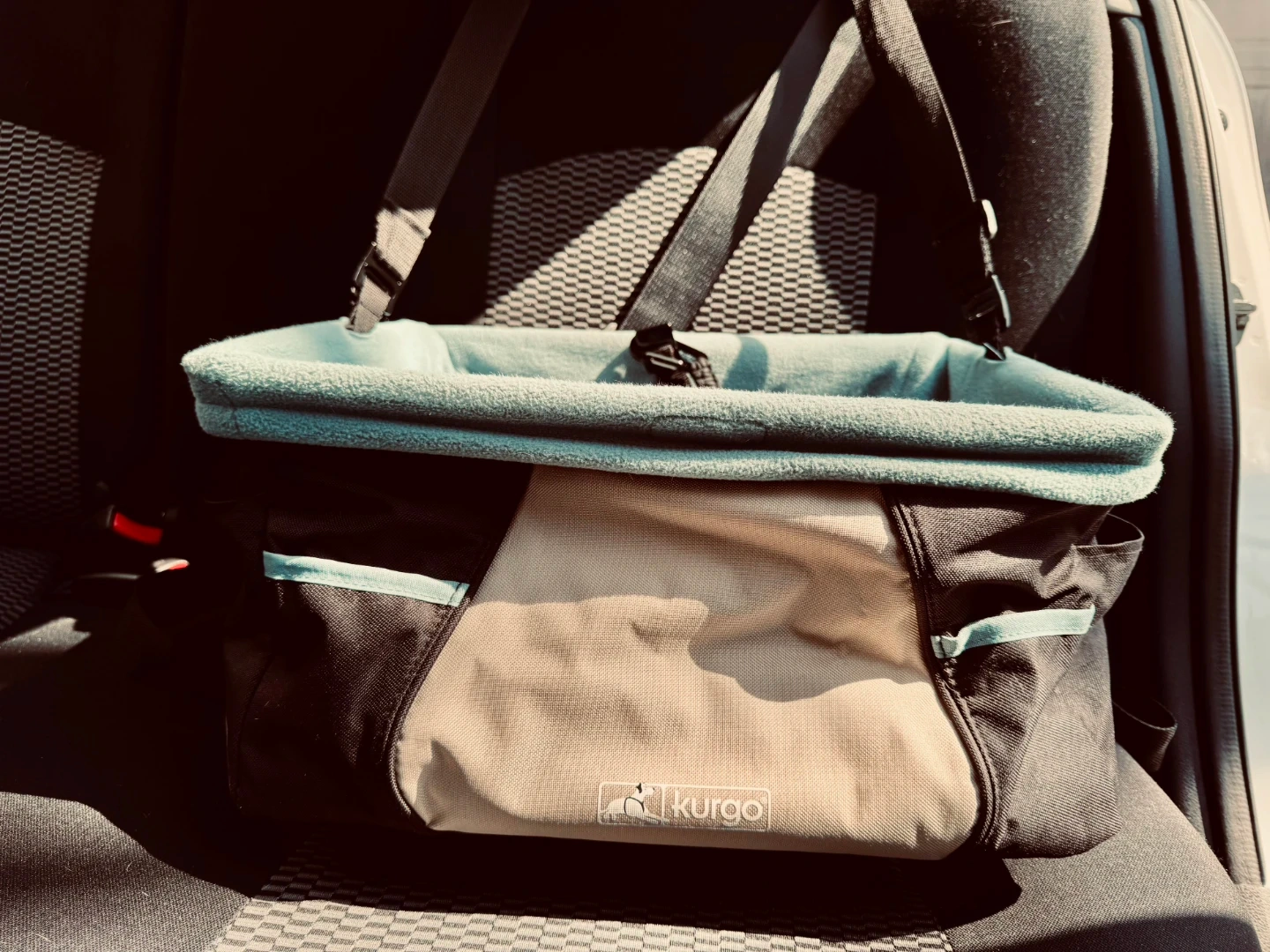 This Kurgo car seat booster is designed for small dogs. It's made with durable materials and has a comfortable interior. It attaches securely to your car's seat for safe travel.