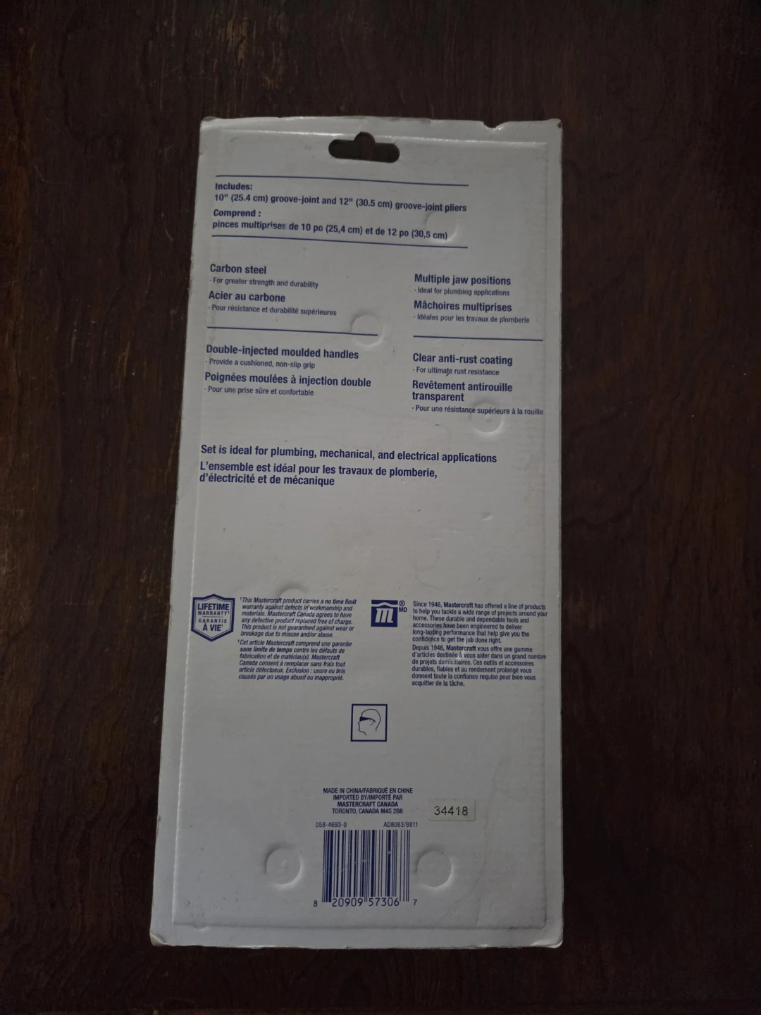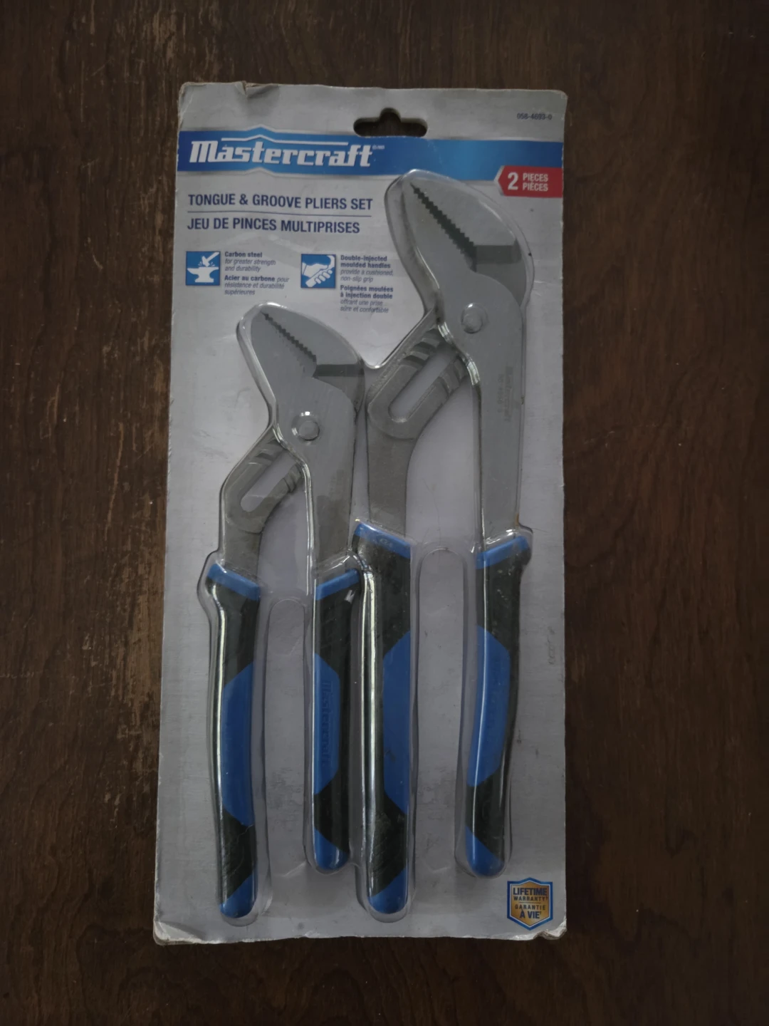 Selling a new Mastercraft tongue and groove pliers set. This set includes two pieces: 10" (25.4 cm) and 12" (30.5 cm) groove-joint pliers.