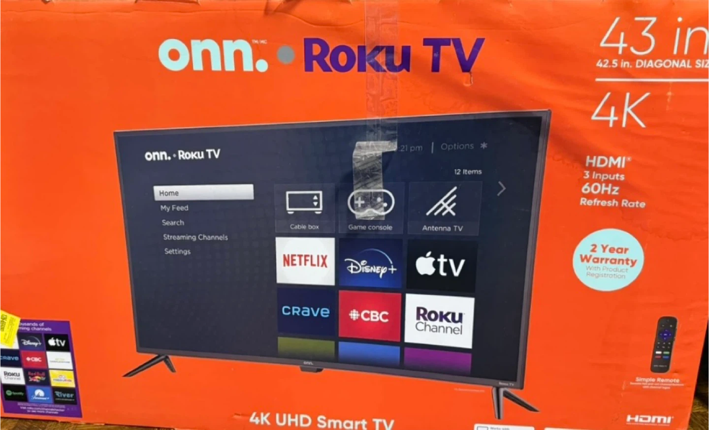 Selling an onn. Roku TV, it's a 43 inch 4K UHD Smart TV. It has HDMI and 3 inputs with a 60Hz Refresh Rate. Comes with a simple remote.