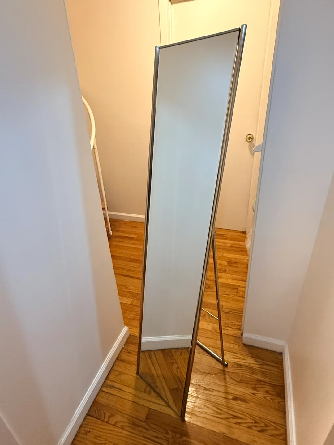 This is a full-length standing mirror. It features a slim metal frame and a convenient folding stand. It's perfect for checking your outfit before heading out!
