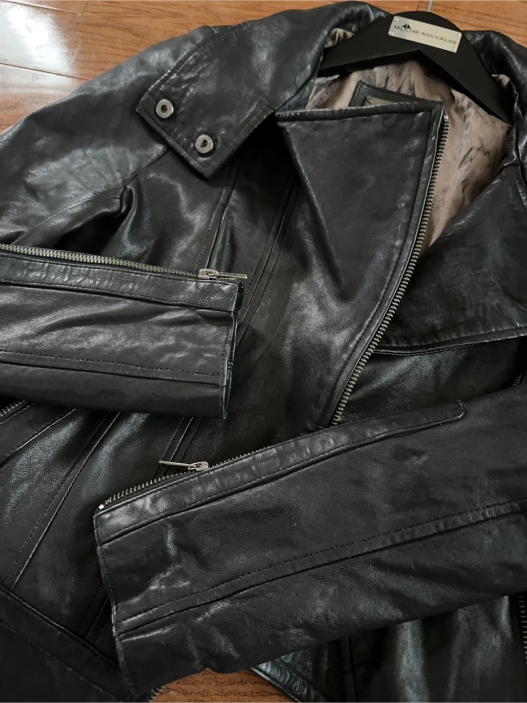Mackage For Aritzia Black Leather Jacket. Beautiful print interior lining. 2 exterior zip pockets. Buttons on collar. Silver-tone hardware. Tonal stitching.