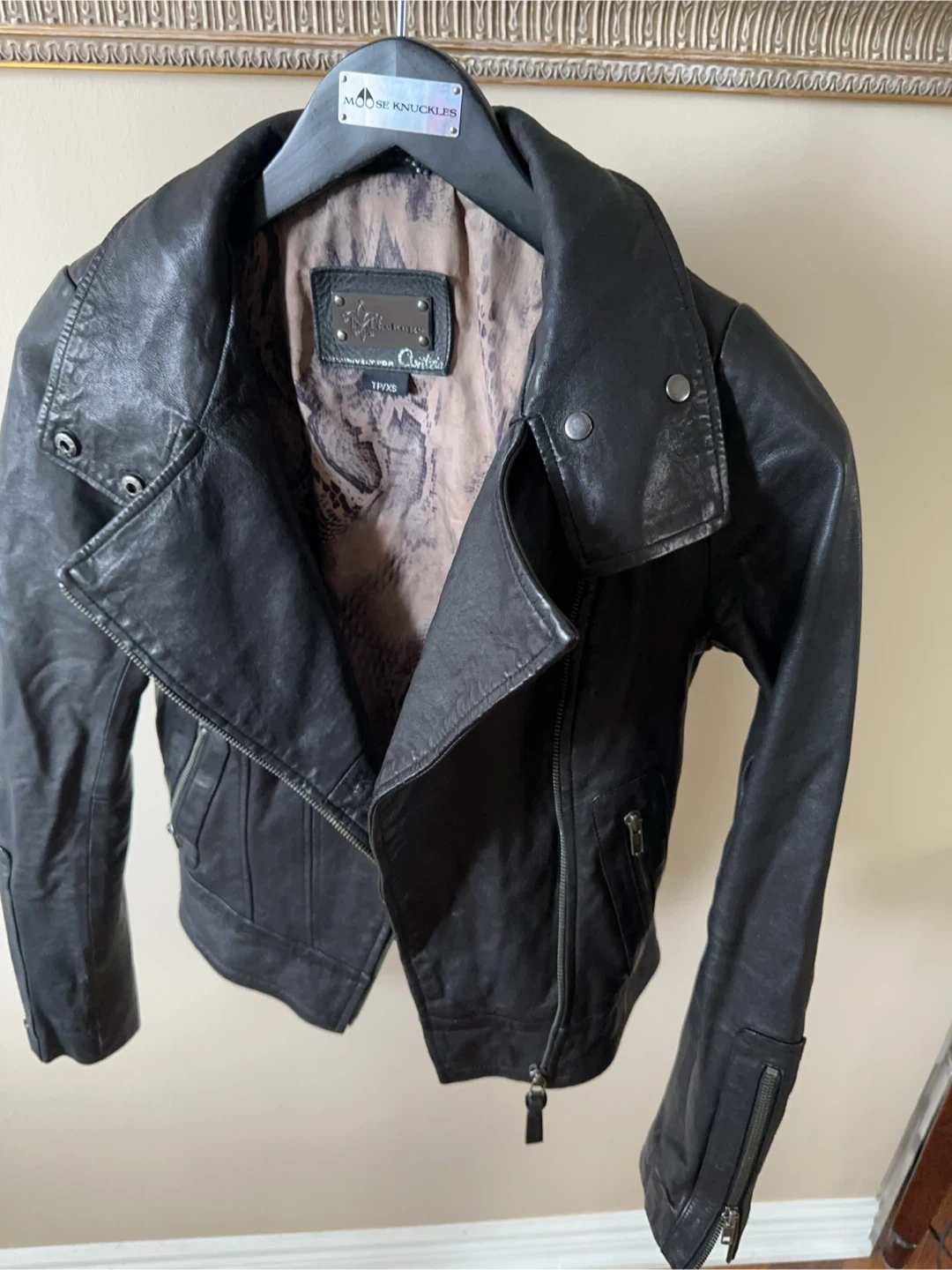 Mackage For Aritzia Black Leather Jacket. Beautiful print interior lining. 2 exterior zip pockets. Buttons on collar. Silver-tone hardware. Tonal stitching.