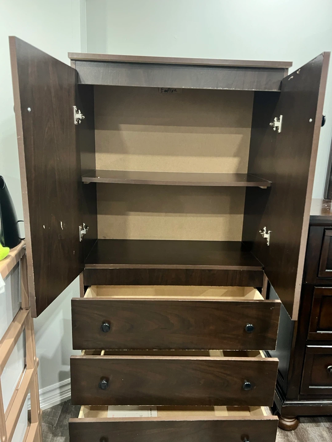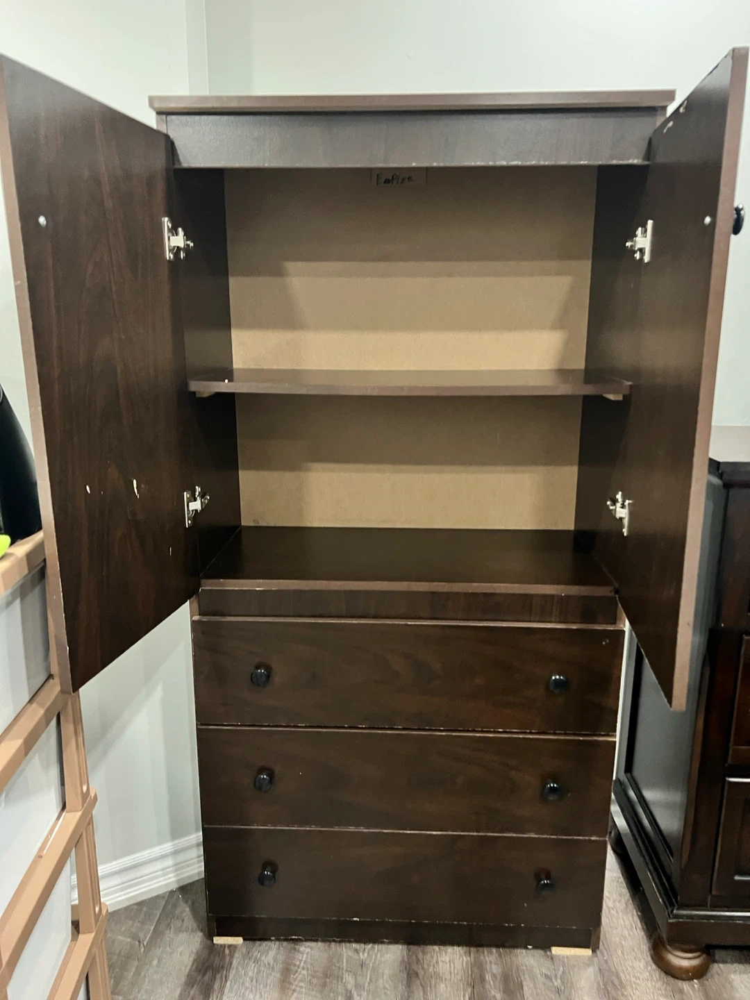 This dark wood dresser features a cabinet top with shelves, perfect for storing clothes or linens. It has three drawers below for additional storage. It's a nice piece for organizing your bedroom!