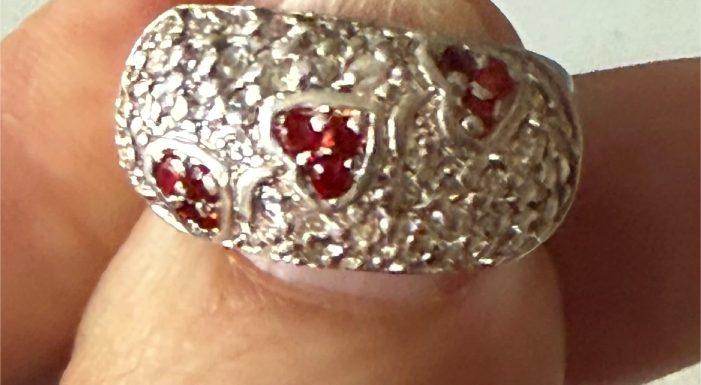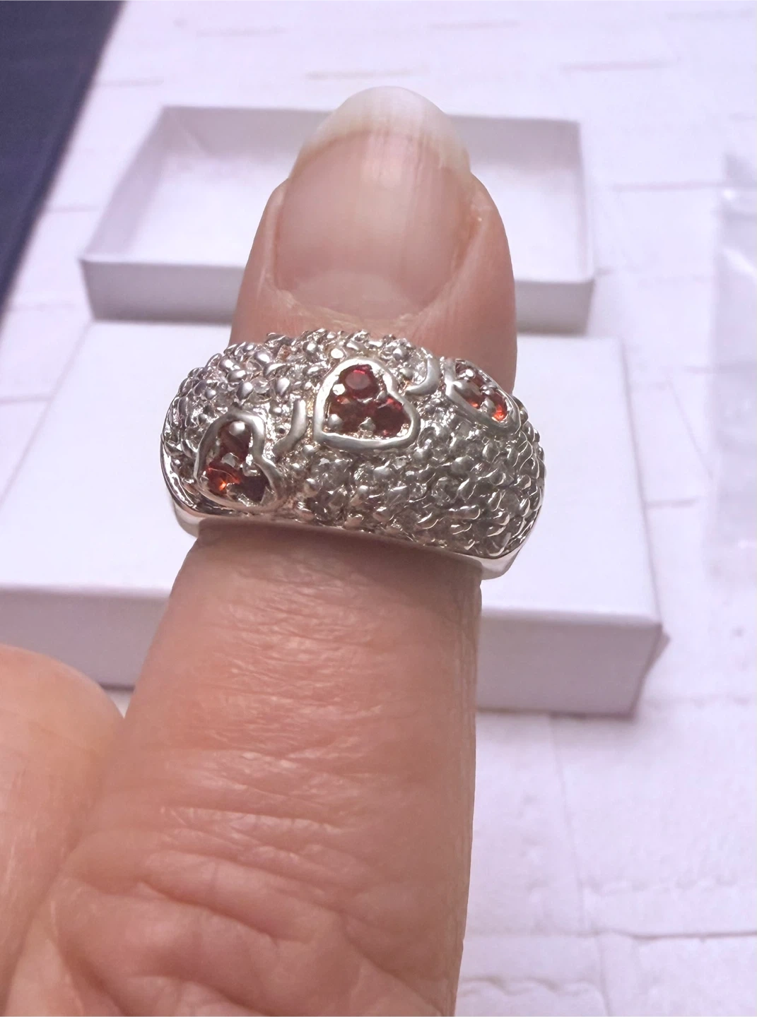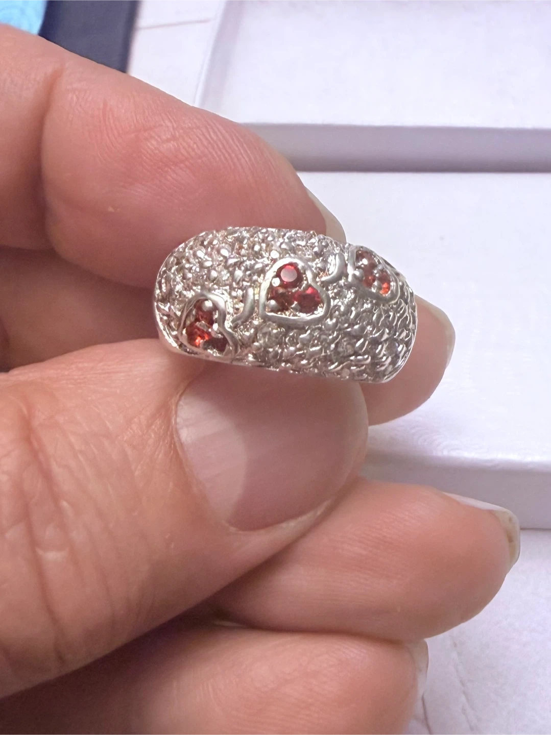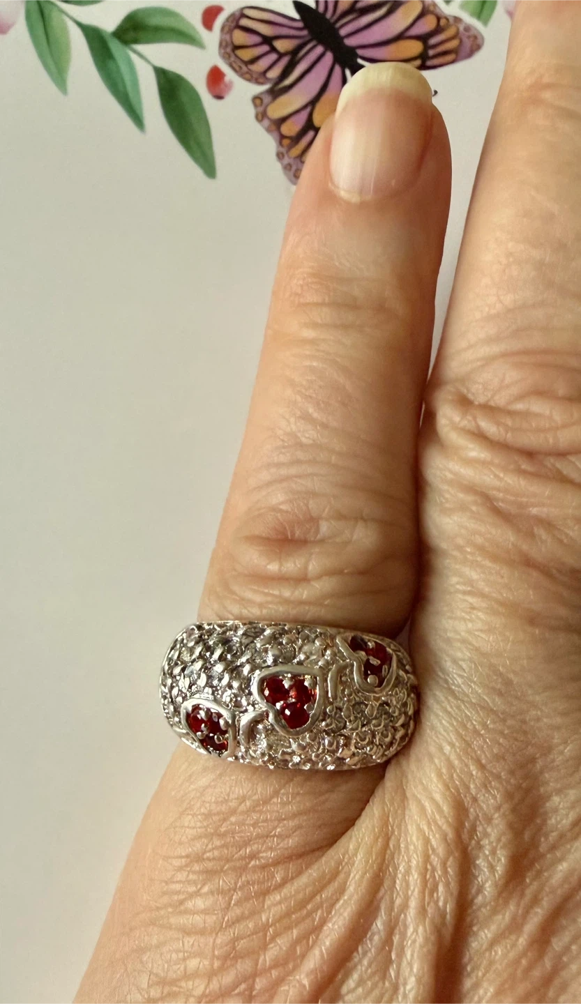 Beautiful 9.7g sterling silver ring featuring a unique textured band with small red heart-shaped gems, encrusted for extra sparkle.