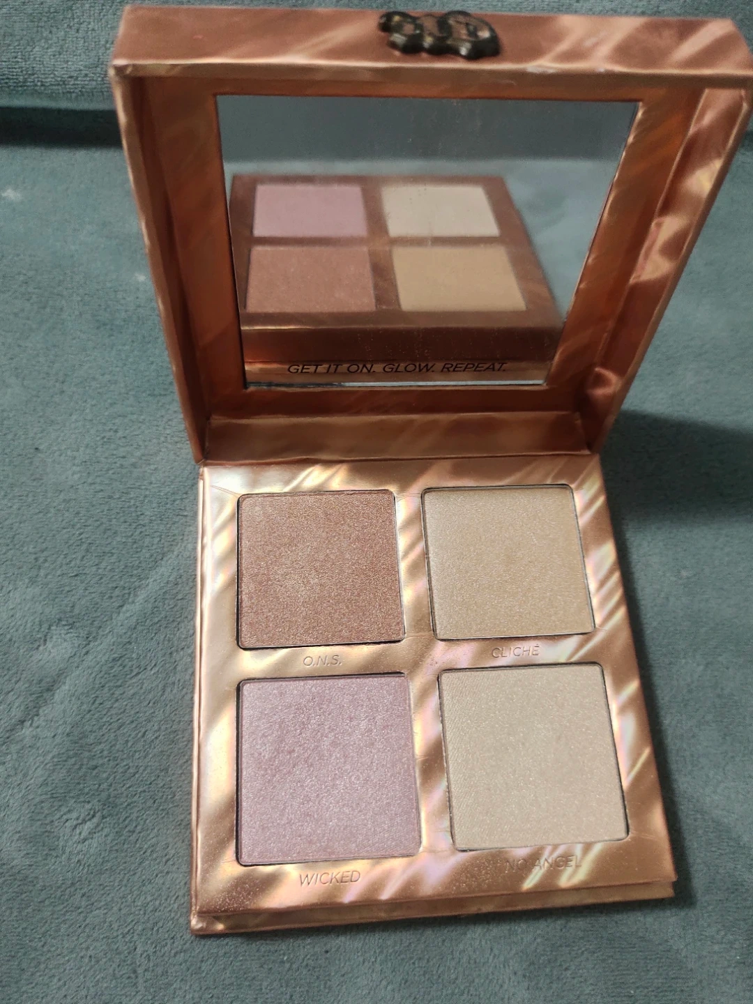 Urban Decay After Glow highlighter palette with four shades. Includes O.N.S., Cliche, Wicked, and Nowness shades. It's perfect for achieving a radiant glow.