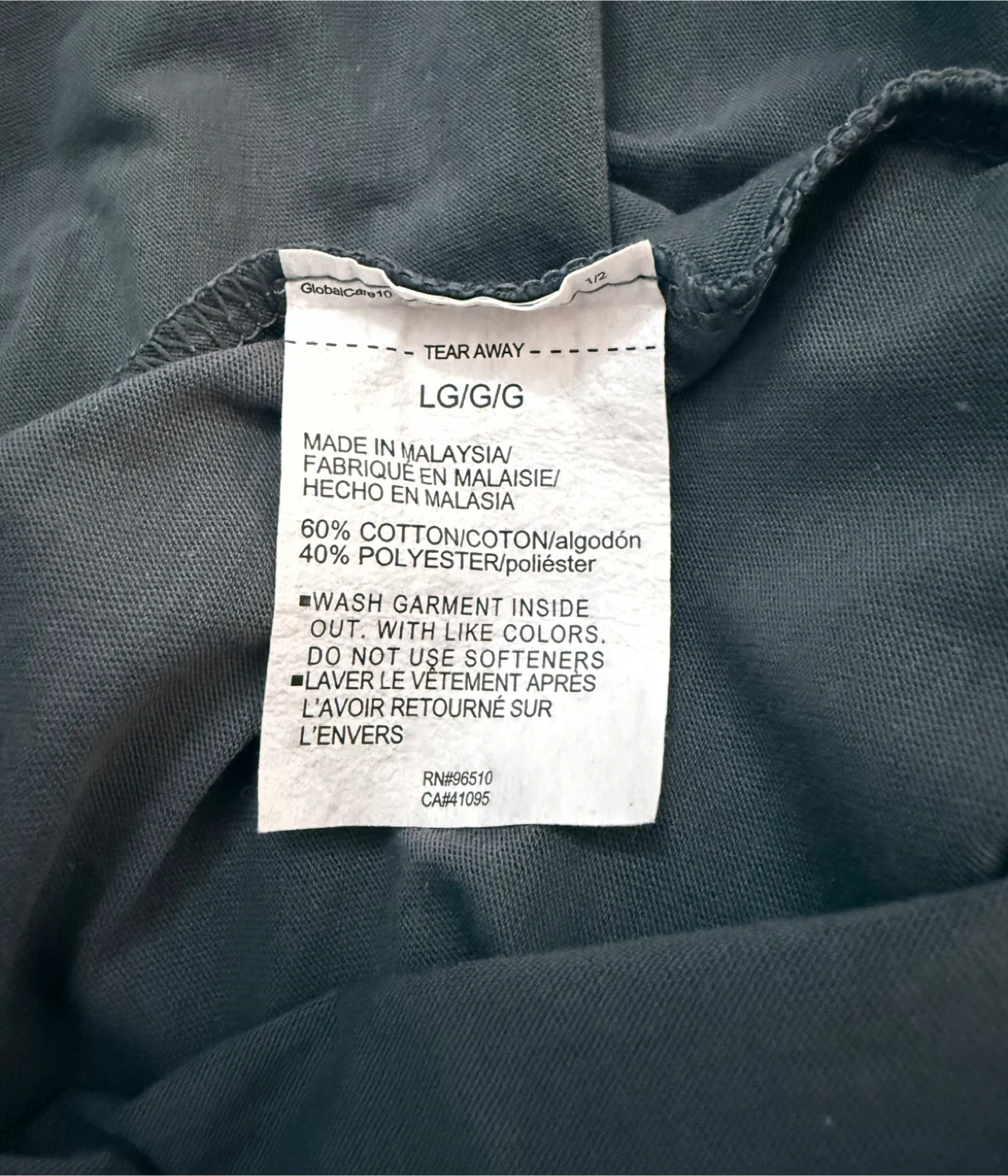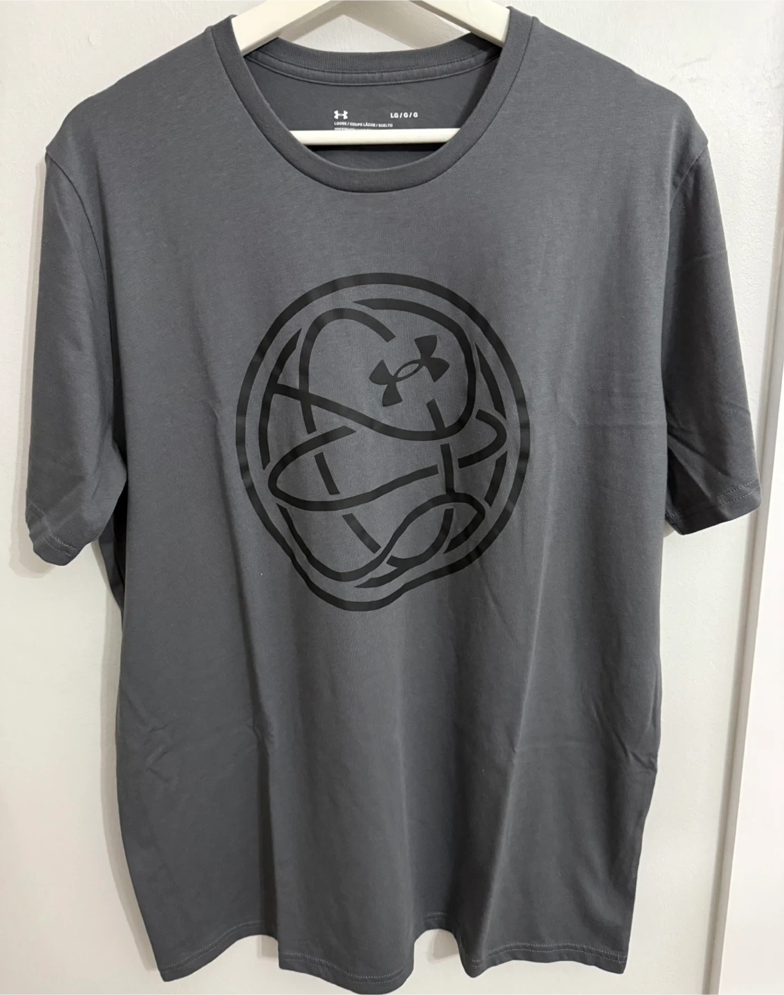 This is a grey Under Armour t-shirt in a loose fit, size large. It's made from a 60% cotton and 40% polyester blend. The shirt features a basketball-themed graphic on the front.