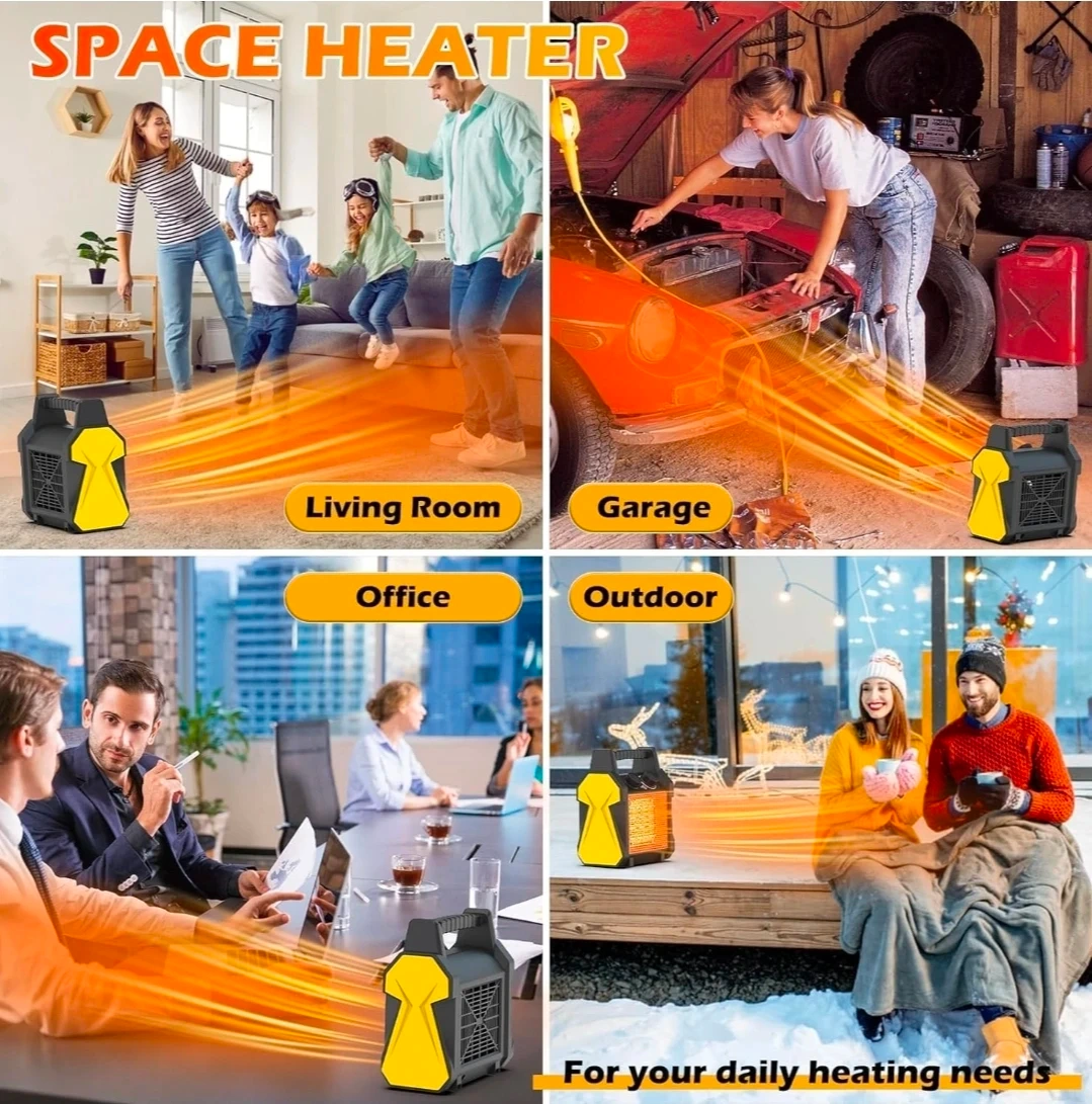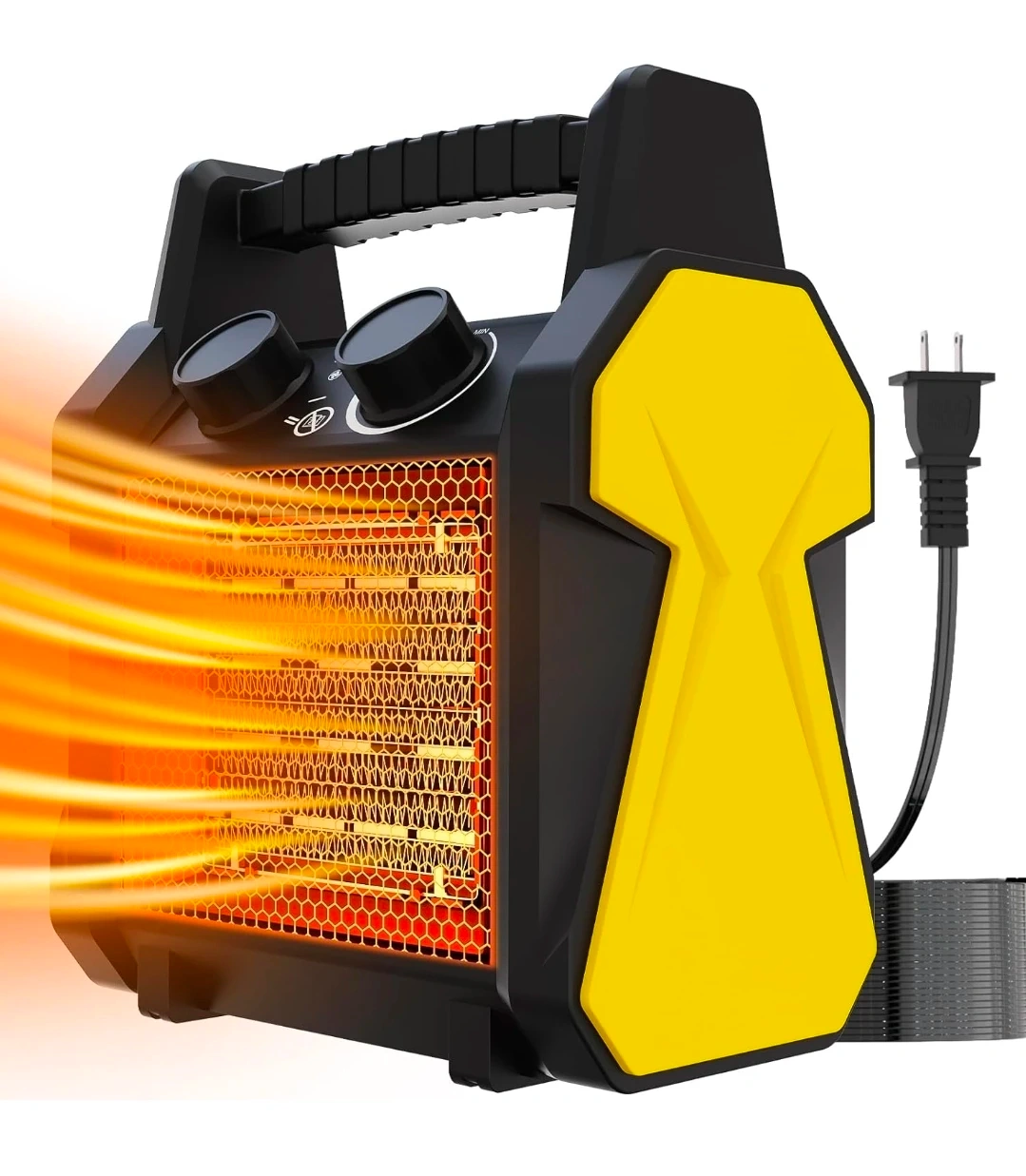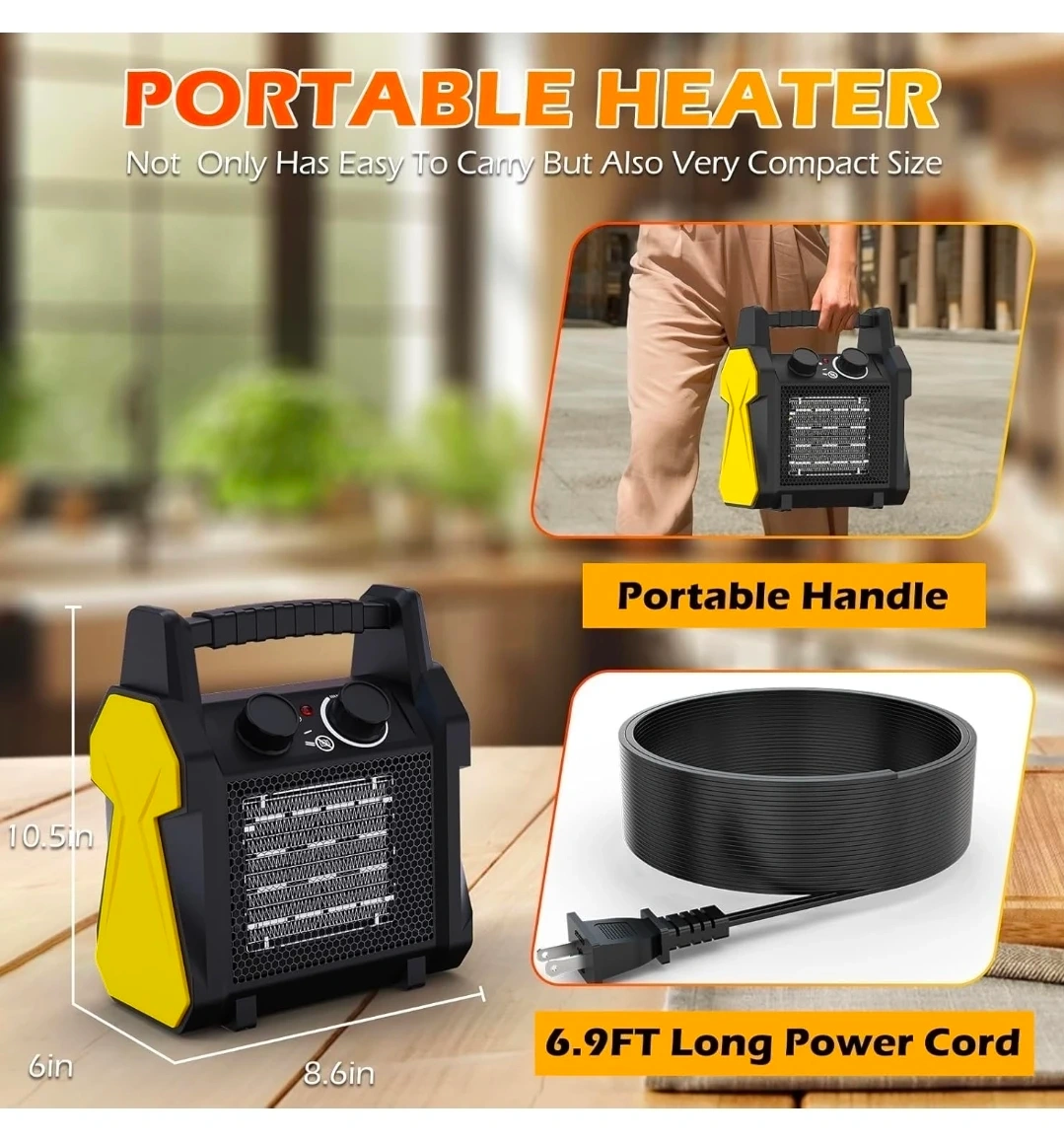 This portable electric heater has three operating modes: 25W Fan Only, 750W Low Heat, and 1500W High Heat. It features anti-tipping switches, auto-off when overheated, and an adjustable thermostat for safety and comfort. The heater is 10.5 inches high, 8.6 inches wide, and 6 inches deep, with a 6.9FT long power cord.