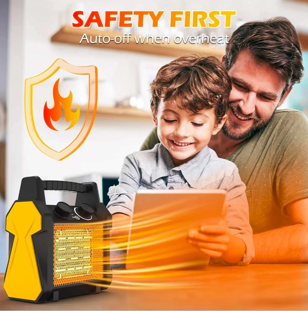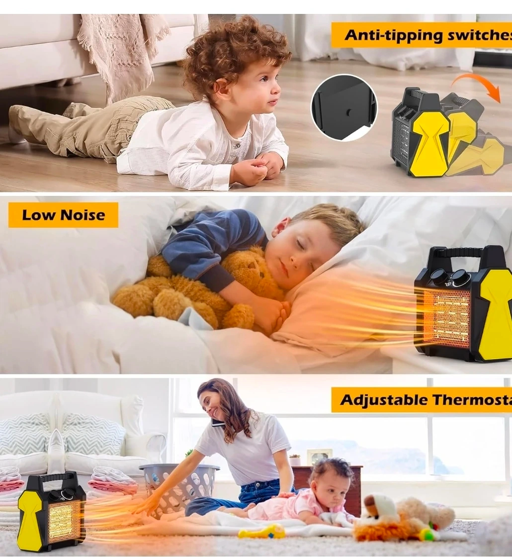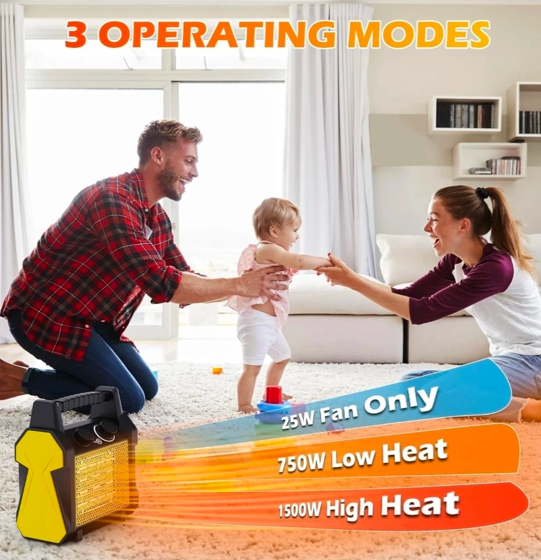 This portable electric heater has three operating modes: 25W Fan Only, 750W Low Heat, and 1500W High Heat. It features anti-tipping switches, auto-off when overheated, and an adjustable thermostat for safety and comfort. The heater is 10.5 inches high, 8.6 inches wide, and 6 inches deep, with a 6.9FT long power cord.