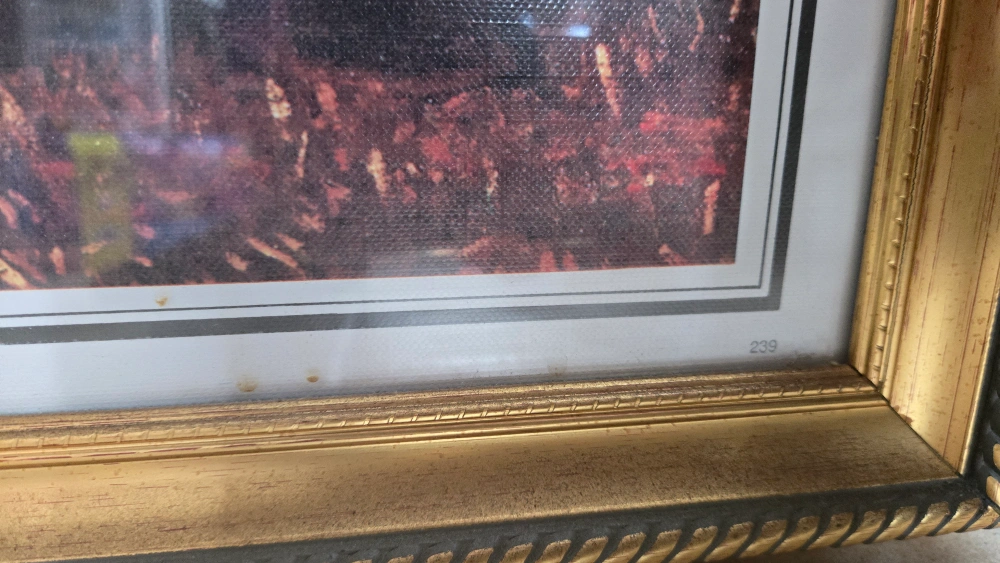Selling a framed print of what appears to be a painting of farm workers. The frame is gold colored and in good condition. The print itself is labeled "Reproduction Interdite".