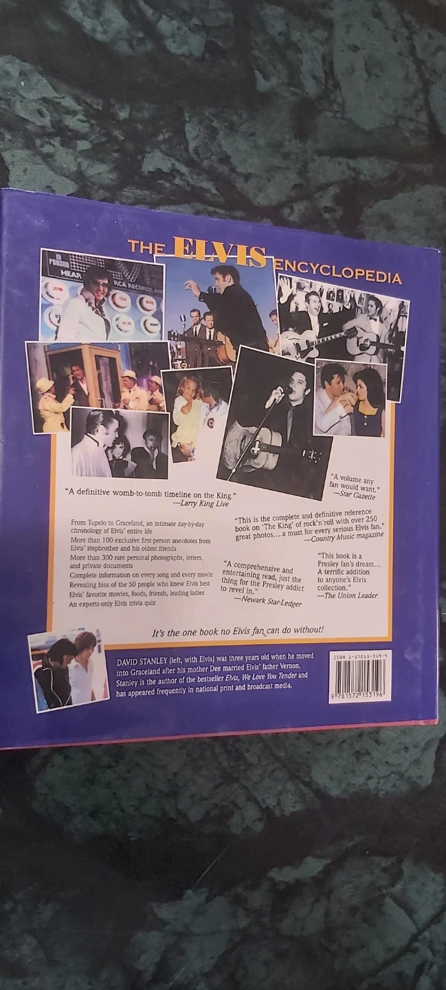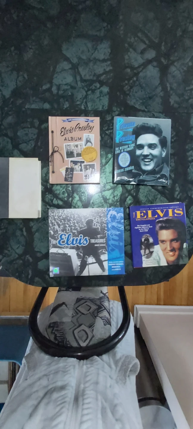 This is a collection of books about Elvis Presley. It includes 'Elvis by Albert Goldman', 'Elvis Presley Album' (25th Anniversary Edition), 'Elvis: The Complete and Definitive Reference Book', and 'The Elvis Encyclopedia'. These books cover his life, career, and music extensively. Hard cover. Great condition minus Elvis by Albert Goodman some staining and wear