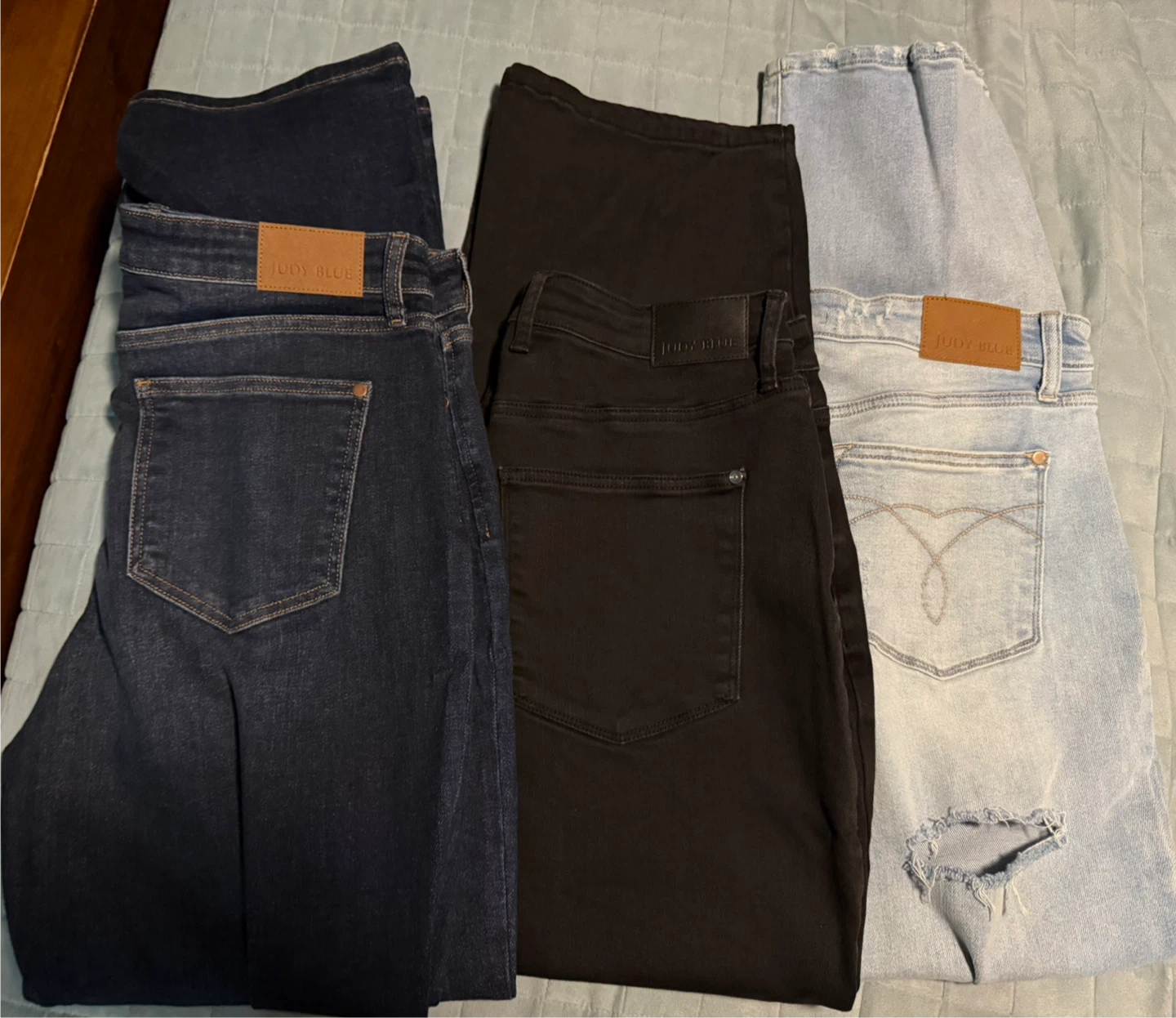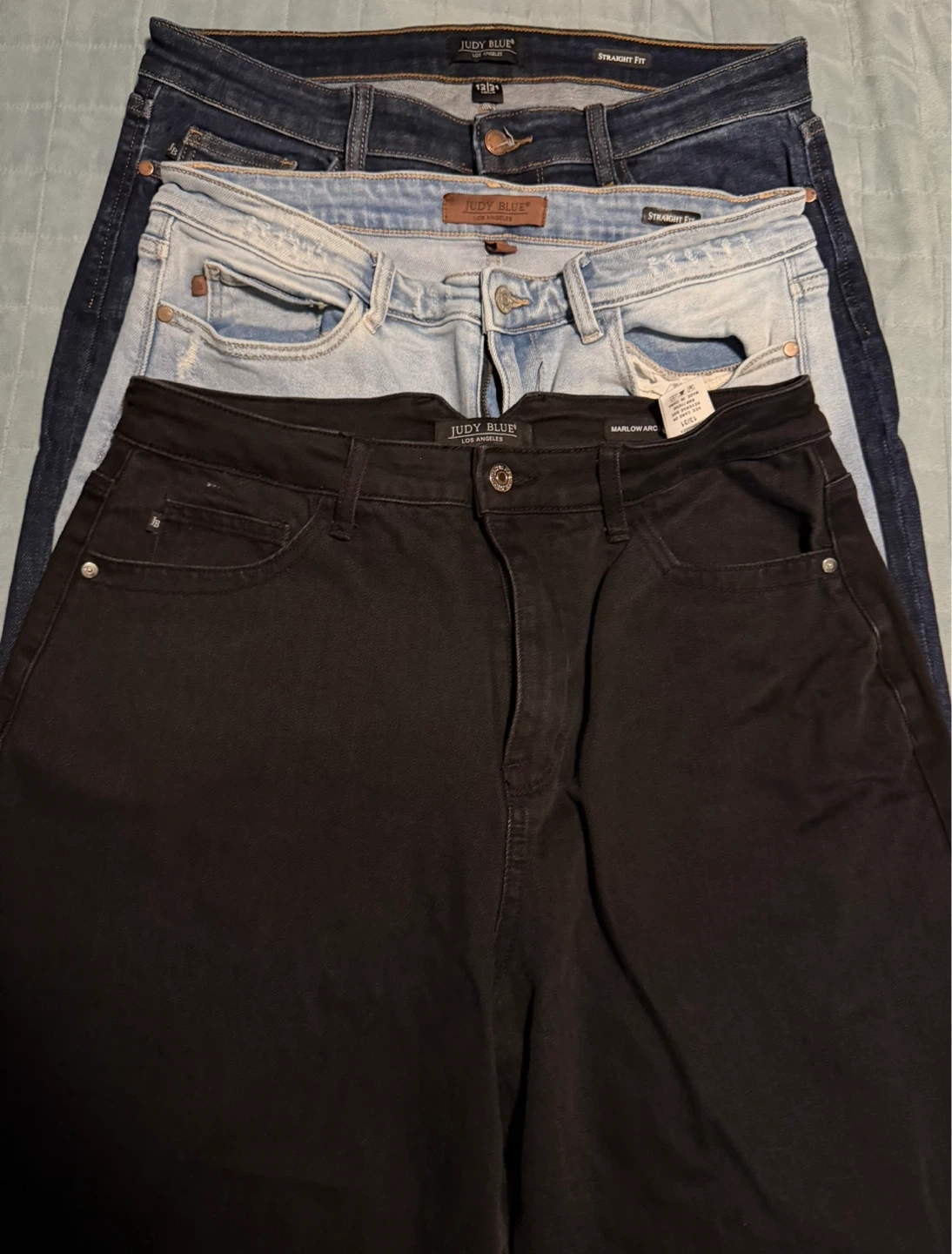 Three pairs of Judy Blue jeans offered. Includes a dark wash, black, and light wash distressed style. Denim construction.