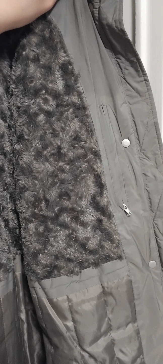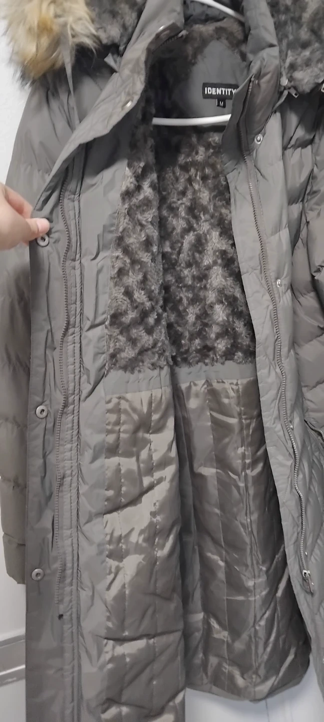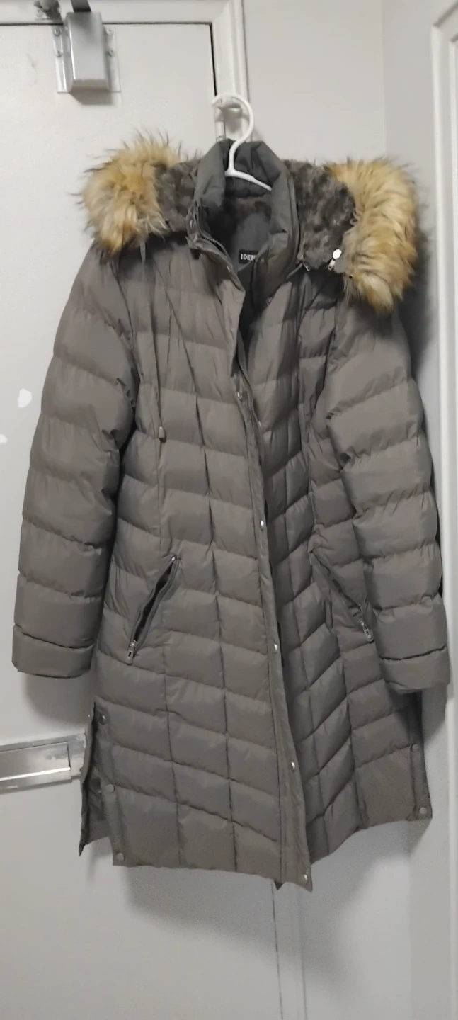 Grey puffer coat from Identity. It's a size medium and features a warm faux fur lining and trim on the hood. Zipper and button closure.There are 2 pockets on the front and 1 inside pocket.It is really warm and falls beneath the knee.Looks really nice and beautiful.