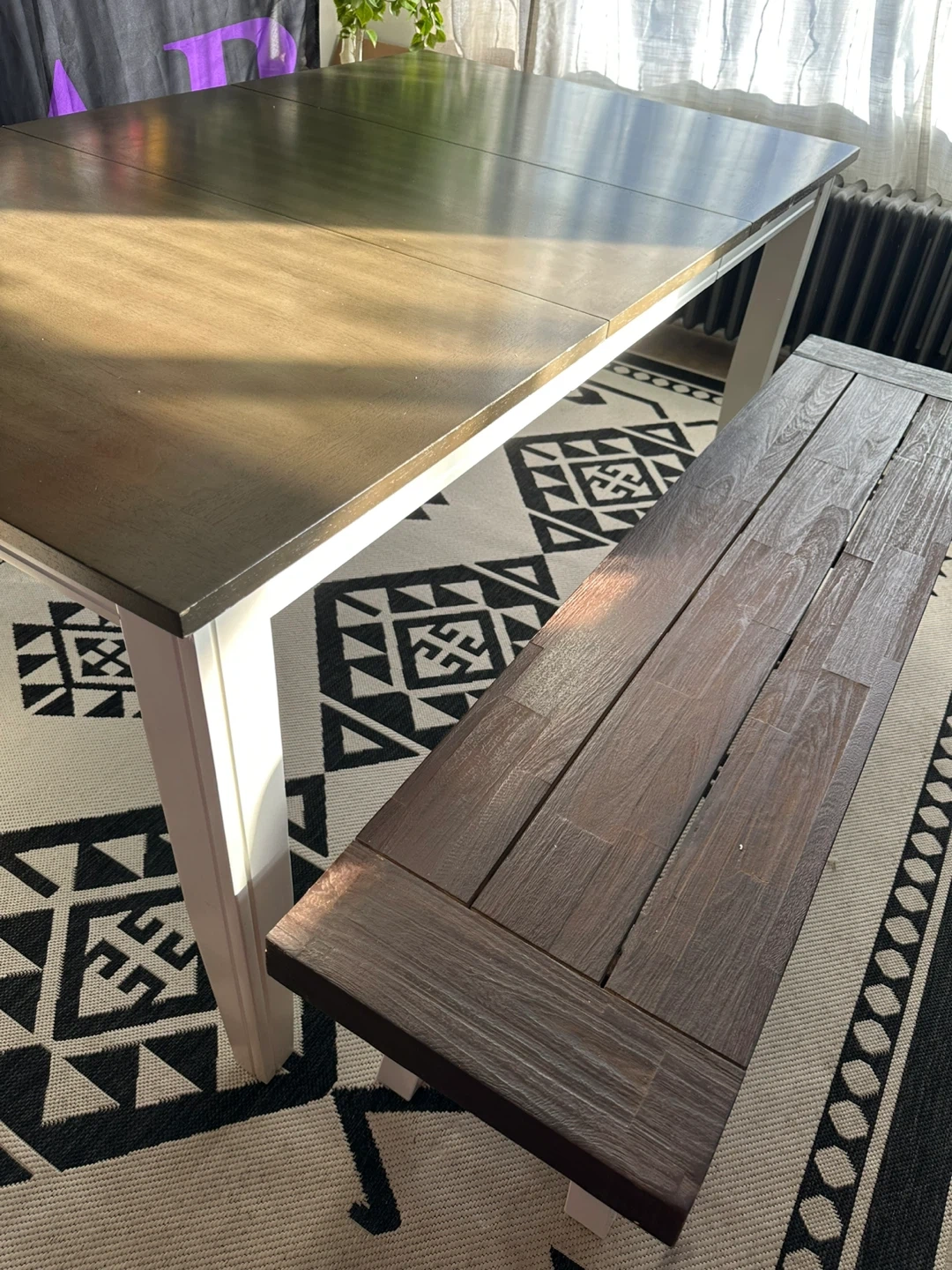 Beautiful two-tone dining set with a dark wood tabletop and white legs, plus a matching farmhouse-style bench.
