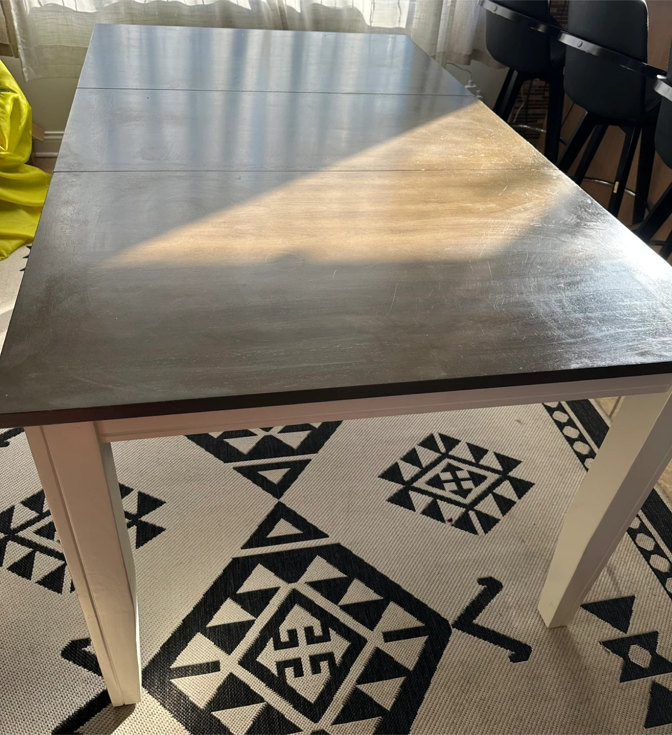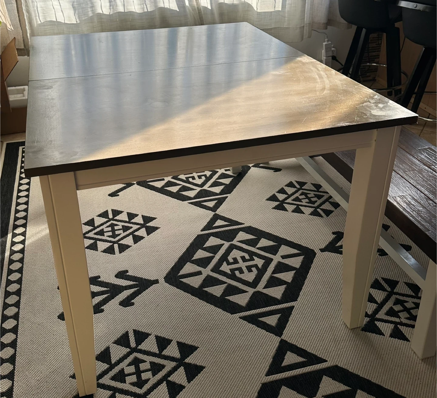 Beautiful two-tone dining set with a dark wood tabletop and white legs, plus a matching farmhouse-style bench.