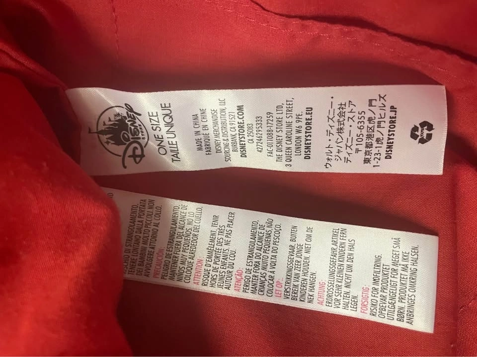 Fun Disney Store tote bag with Mickey and Minnie Mouse. Features a canvas-like exterior with bright red fabric inside, red handles, and a small inside pocket. One size.