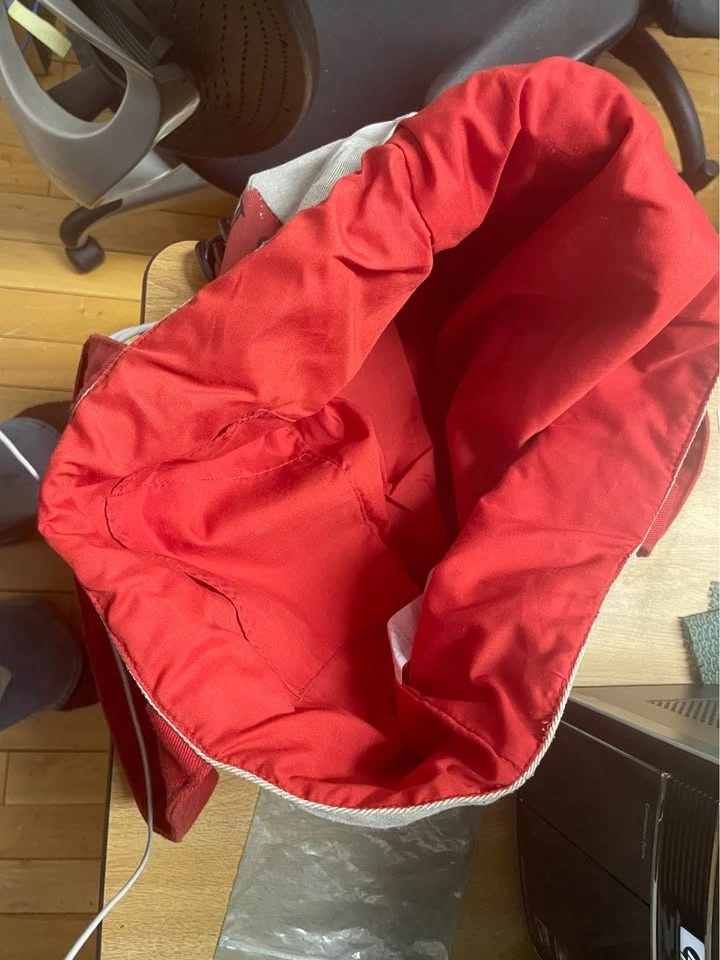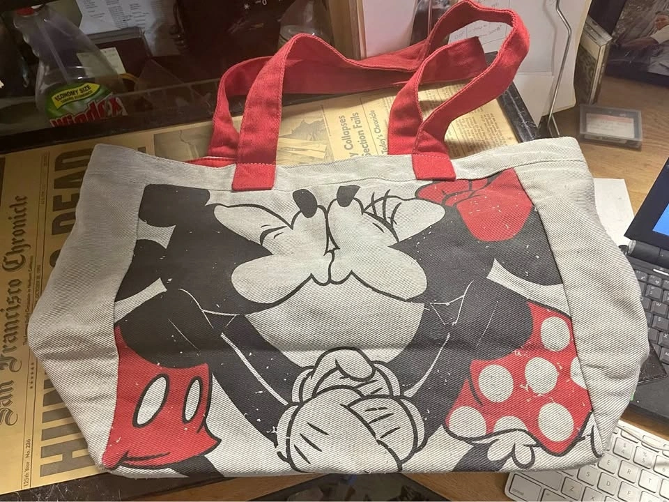 Fun Disney Store tote bag with Mickey and Minnie Mouse. Features a canvas-like exterior with bright red fabric inside, red handles, and a small inside pocket. One size.