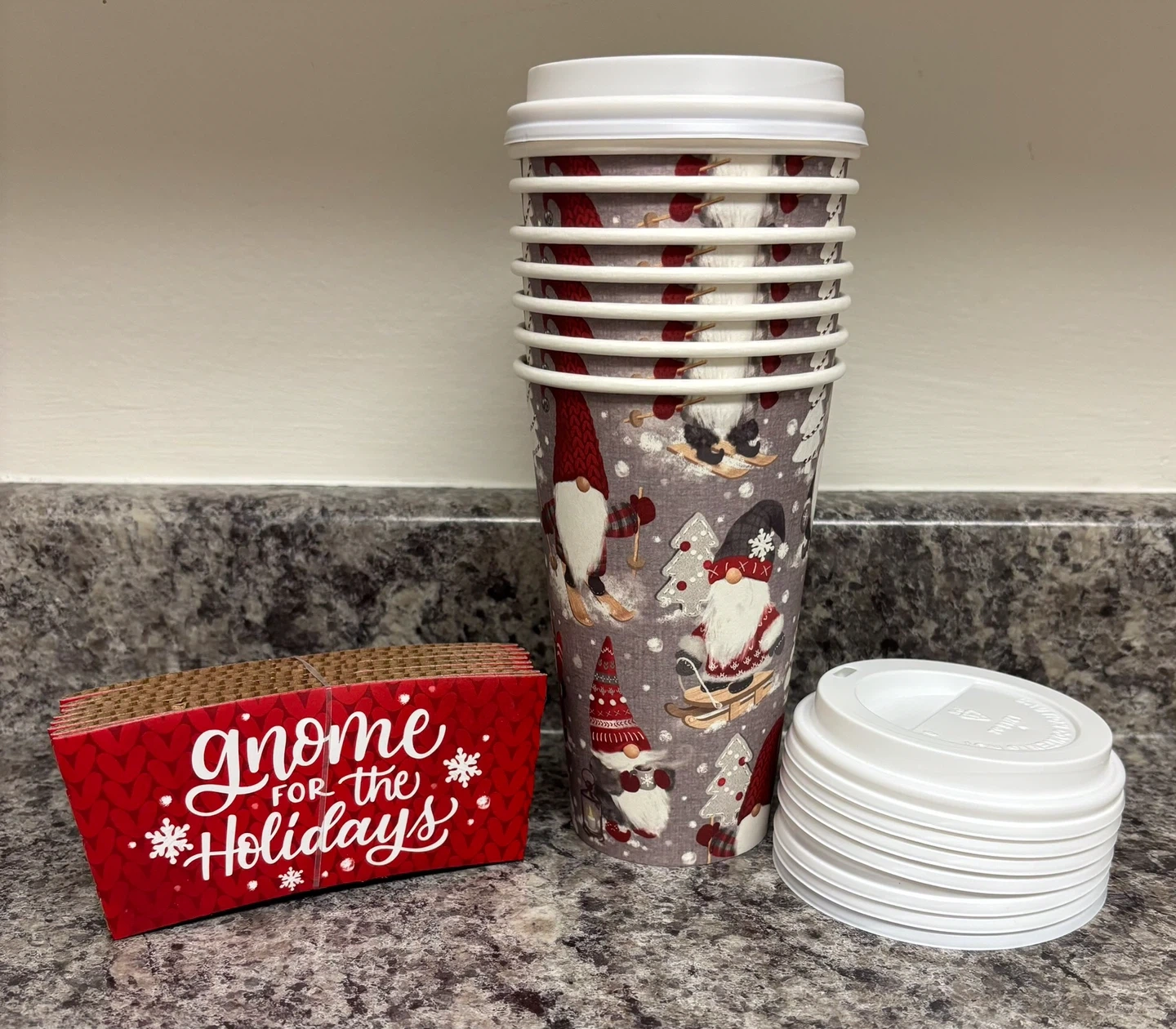 88I have a stack of paper coffee cups with a cute gnome design for the holidays! They come with lids and sleeves, perfect for keeping your hands warm while you enjoy your favourite hot beverage, there’s 8 of each. Info in photo All as is, my listings are deleted when something is sold & new items added all the time Available 11-3 for pick up $10.00 exact cash only