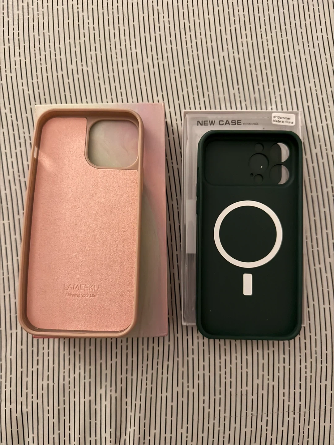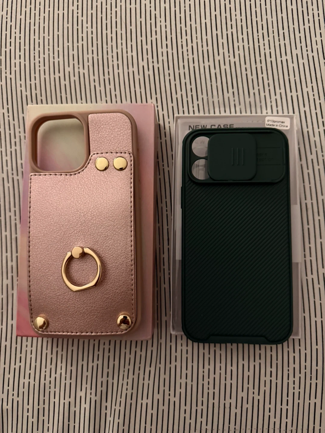 Two iPhone 13 Pro Max cases included. One rose gold Lameeku case with a built-in ring holder and a kickstand. The other is a dark green protective case with a sliding camera cover. Both cases offer MagSafe compatibility.
