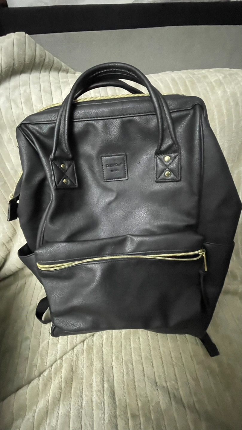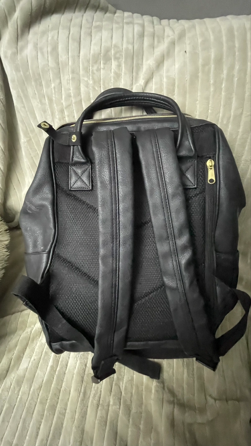 Large black backpack. Faux leather material. Gold-toned hardware. Multiple compartments and pockets. Adjustable straps. Great for everyday use or travel.