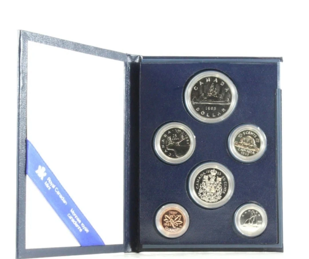 The Royal Canadian Mint started producing specimen sets for the public in 1970. Since then, they have been a favourite among collectors. This 1983 Canada Specimen Set includes 6 coins that were in circulation at this point in time. The set includes the nickel Voyageur dollar, 50-cent, 25-cent, 10-cent, 5-cent, and 1-cent coins. The coins come in a leatherette case and have a mintage of 60,329. As typical the outer cardboard may have some light wear.