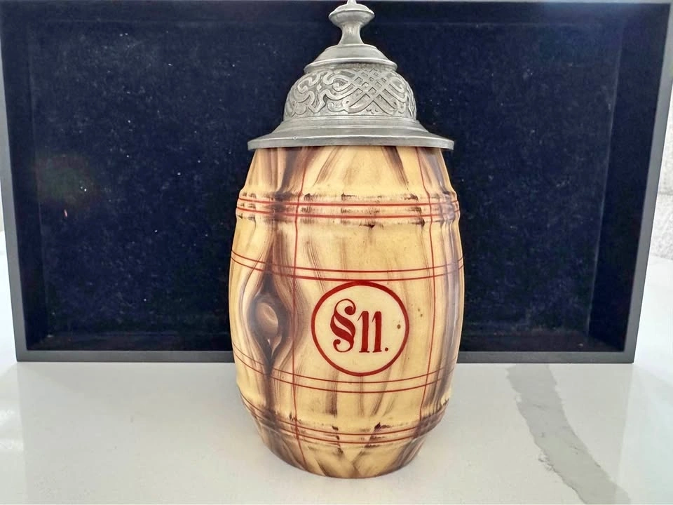 Antique German beer stein. A "Daubenkrug" style or barrel design with a pewter lid marked NBM and a red handle. The front has '§11.' referring to a humorous regulation in German student and craftsman drinking culture known as the Bier-Comment (Beer Code). Paragraph 11 reads: "Es wird fortgesoffen," which translates to "Keep on drinking."