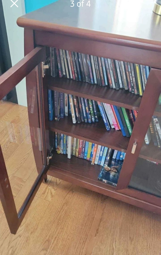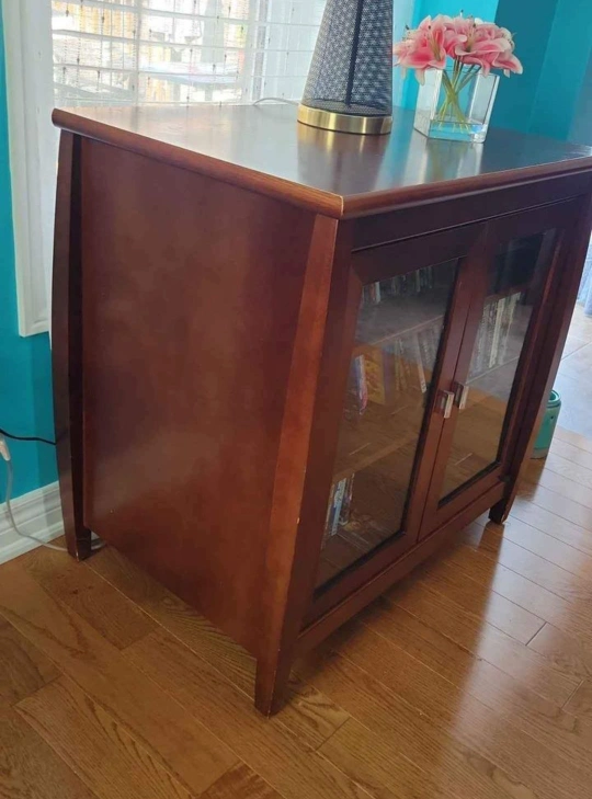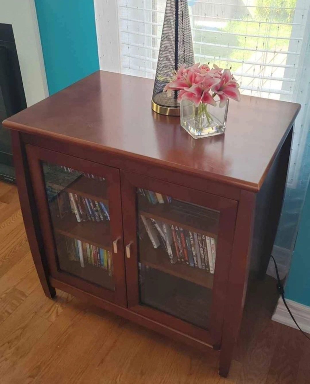 2 Cabinets with glass door & shelves. Can be used for anything. W29.5, D19.5, H30. Very minimal scufs, mostly around legs from vacuum. Overall close to excellent Condition.