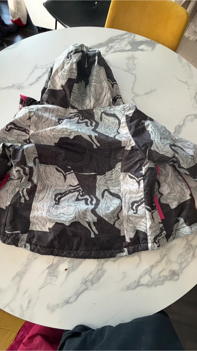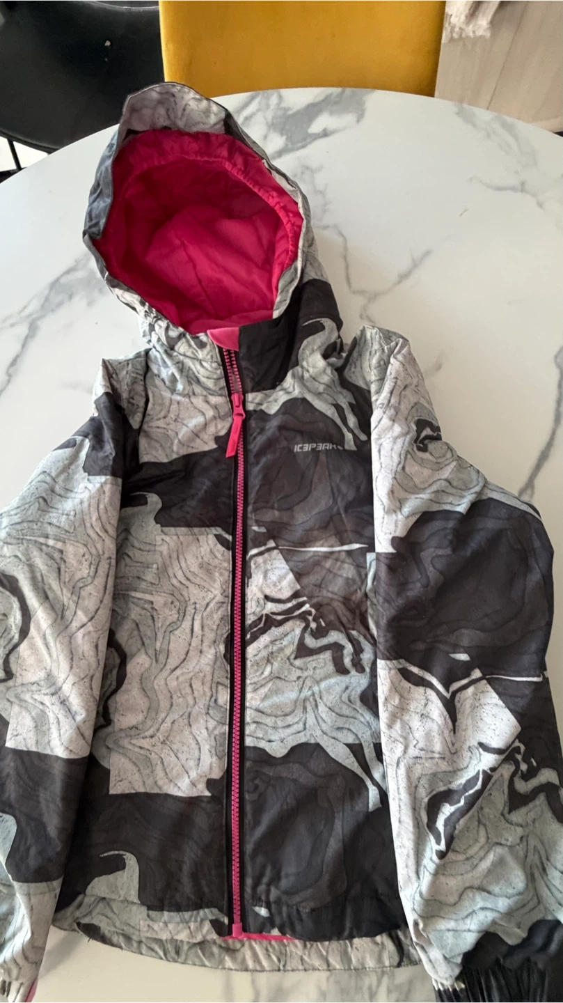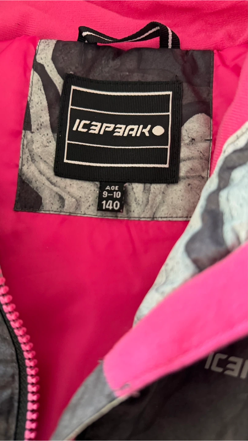 This is a kids ski jacket and pants set from Icepeak. The jacket is gray, black, and white with a pink lining. The pants are bright pink. Size is 9-10 years. This set's great for hitting the slopes!
