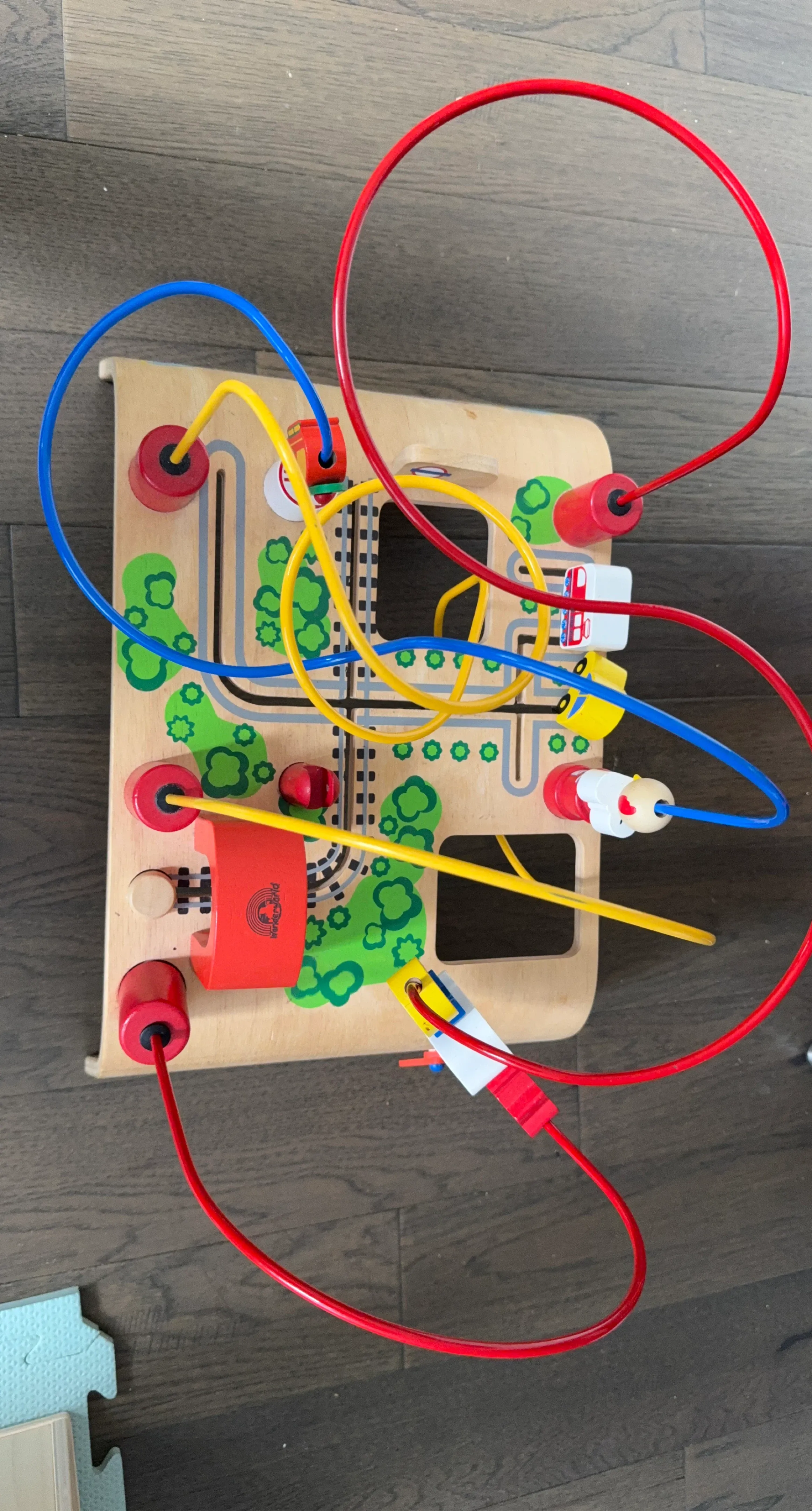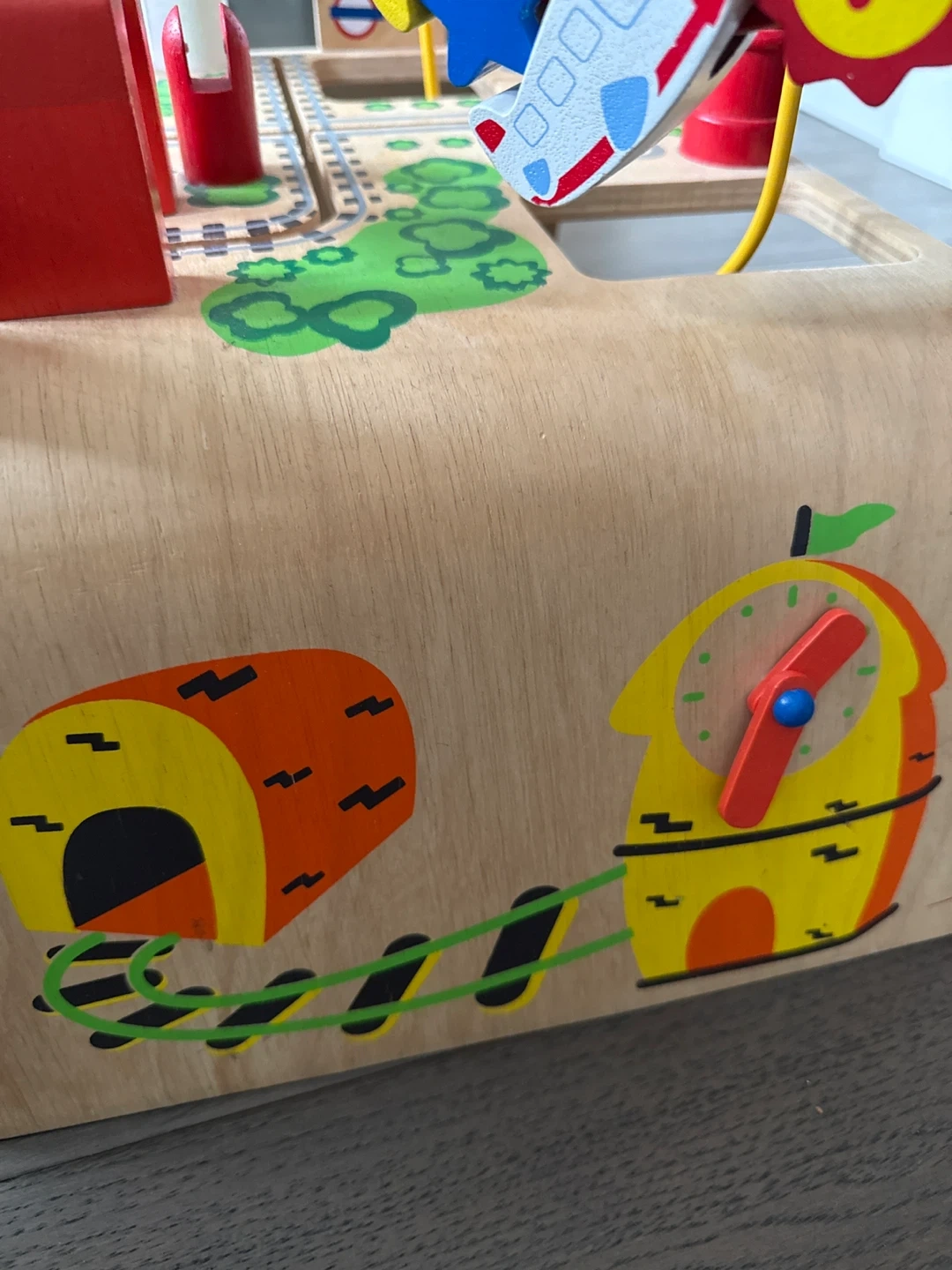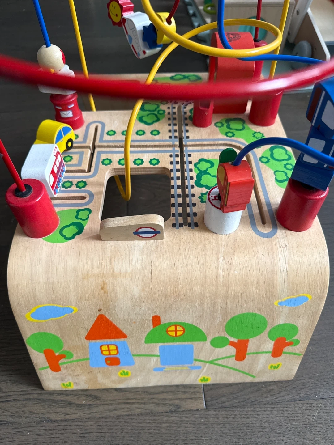 This wooden activity cube features a bead maze with colourful wires and wooden beads. It also has tracks with little cars and a train on it. It's great for developing fine motor skills. Ideal for toddlers! Cash and pick up.