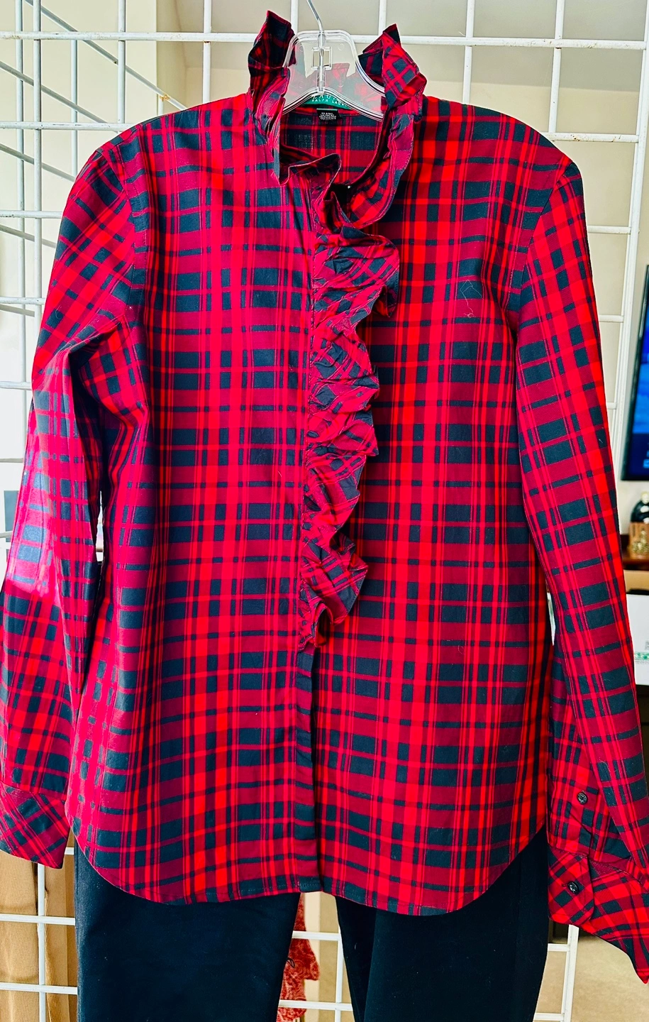 Women's size medium long-sleeved button-down shirt. Red and black plaid pattern. Features a ruffled front. 100% cotton.