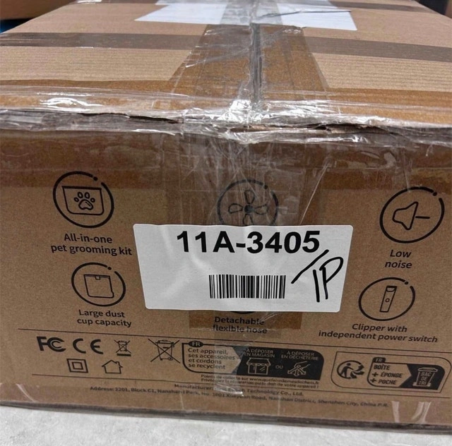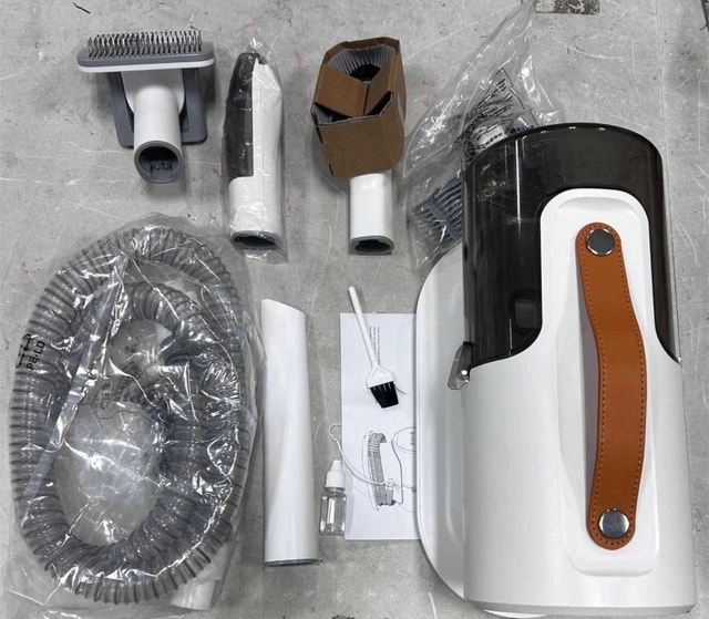 FIXR Dog Grooming Kit with 12000pa suction. Includes vacuum brush for shedding and 5 beauty tools. Comes with a 2L dust cup, operates at low noise, and has 3 levels. All parts are in perfect condition.
