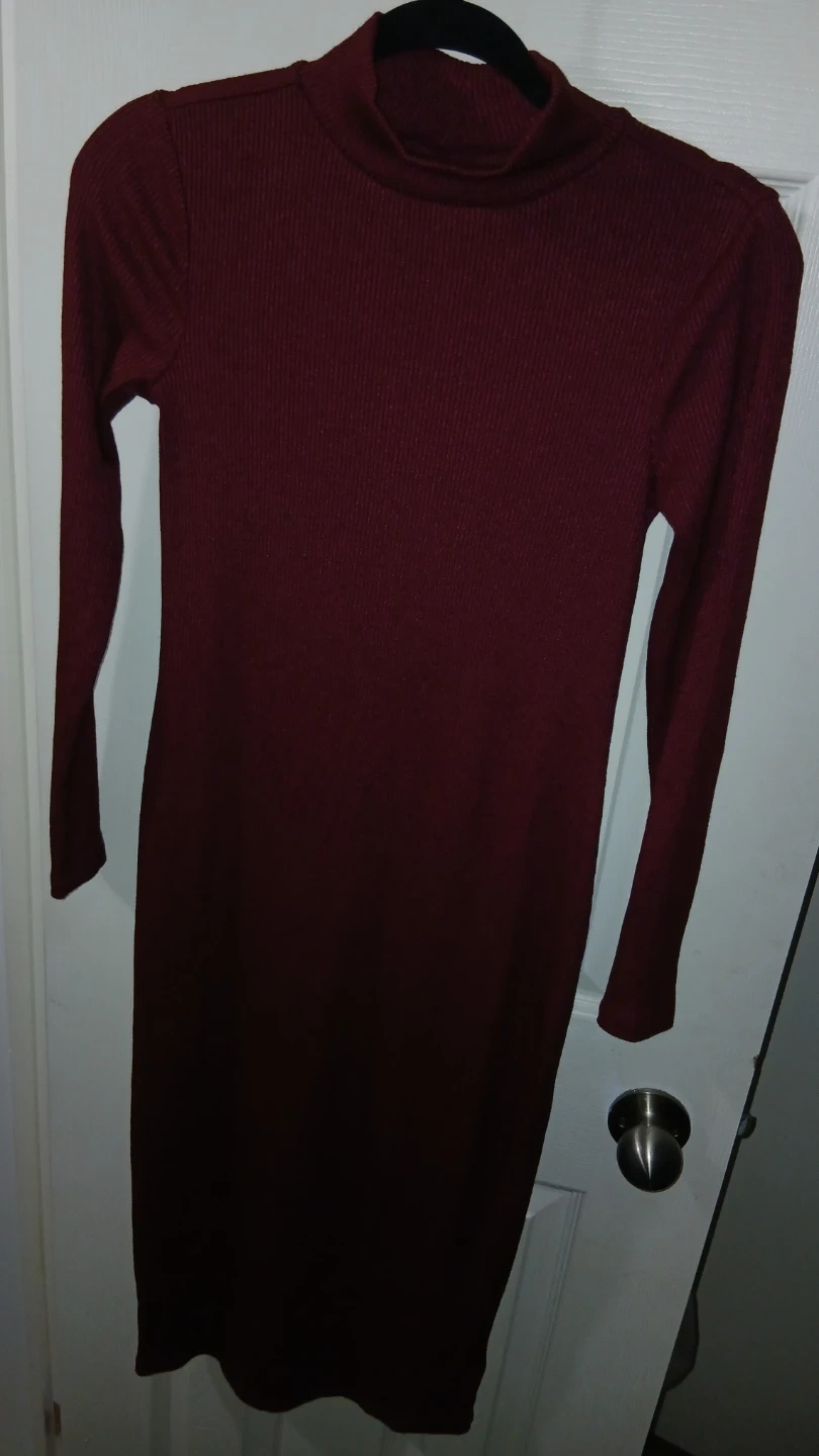 This is a Gap ribbed mock neck sweater dress in burgundy. It's a size XS/TP Petite & It's made from a comfortable & stretchy ribbed knit fabric. NWT, never worn.
